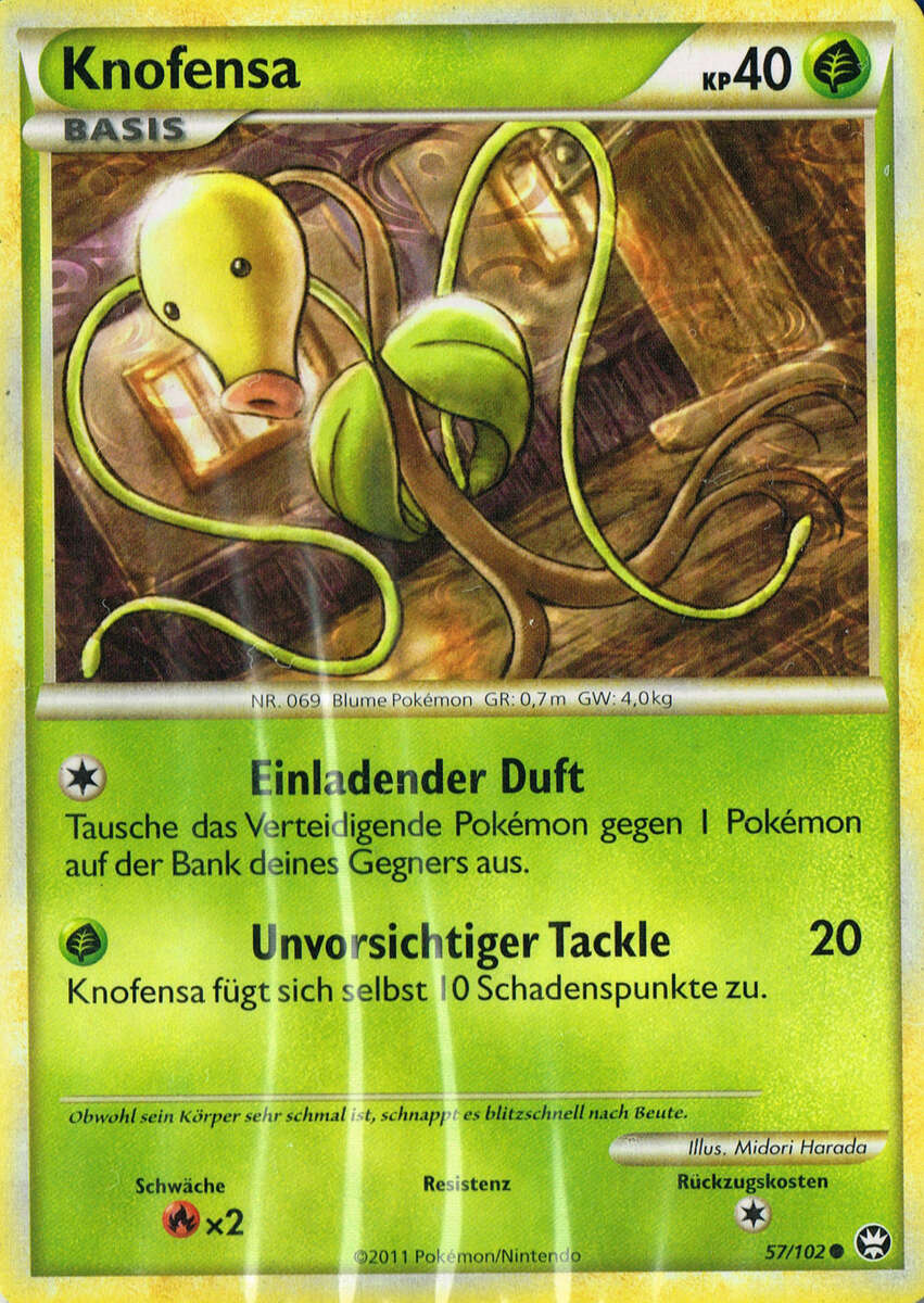 - G Dieses Pokémon bevorzugt einen feuchten und warmen Lebensraum. Knofensa ernährt sich von Insekten.