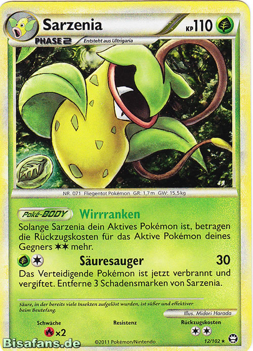 - RS Aus SARZENIAs Kopf ragt eine lange Ranke hervor. Diese schwingt hin und her, als ob sie etwas fangen möchte. Wenn sich ahnungslose Beute nähert, wird sie von diesem POKéMON im Ganzen verschlungen.