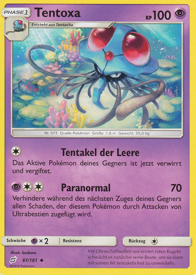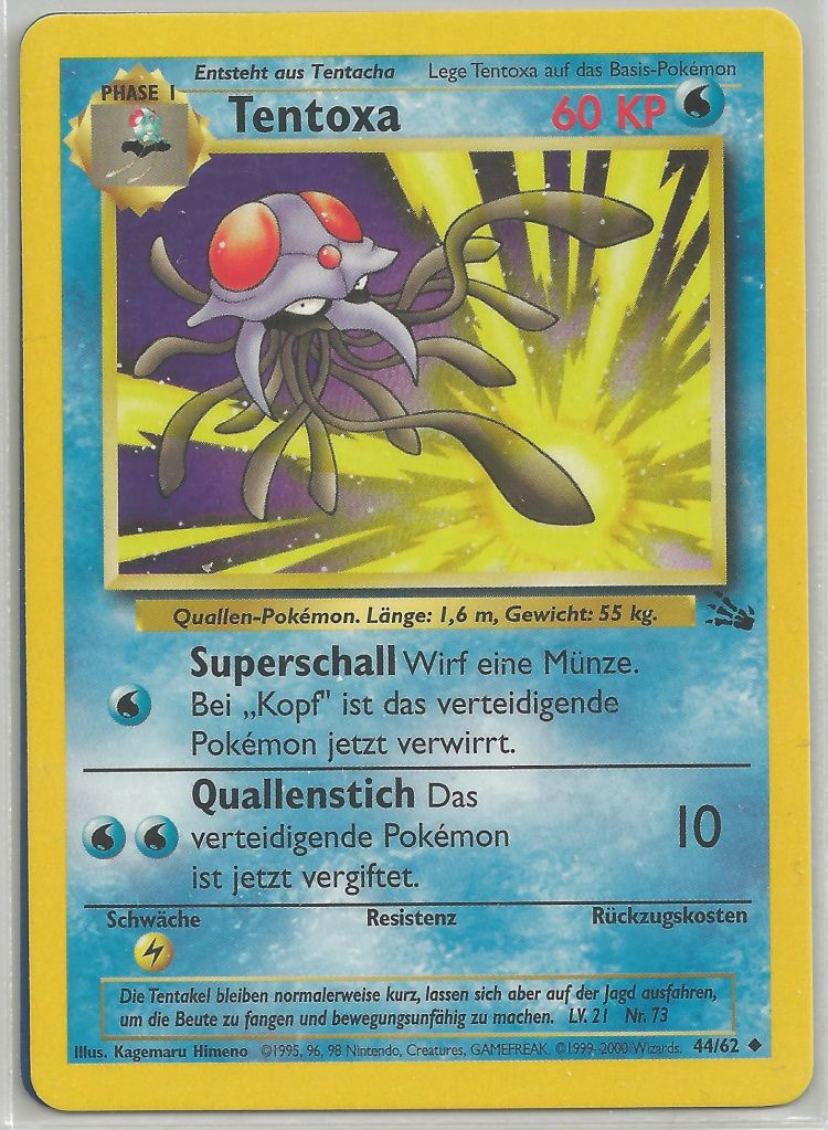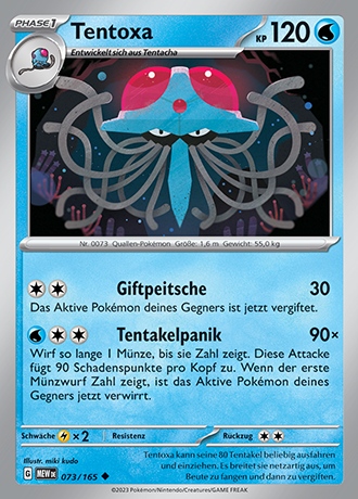 - OR Tentoxa hat große, rote Kugeln auf seinem Kopf. Sie glühen auf, bevor sie seine Gegner mit Ultraschall erschüttern. Ein Ausbruch dieses Pokémon erzeugt starke Wellen in seiner Umgebung.