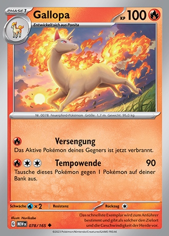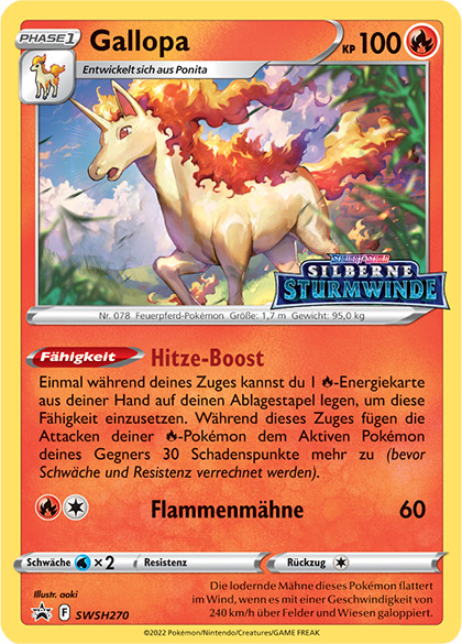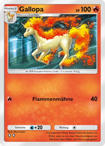 - S Dieses Pokémon kann schnell wie ein geölter Blitz laufen. Es versucht sogar, sich gegen Autos und Züge im Wettrennen zu behaupten.