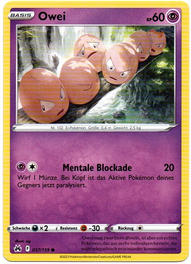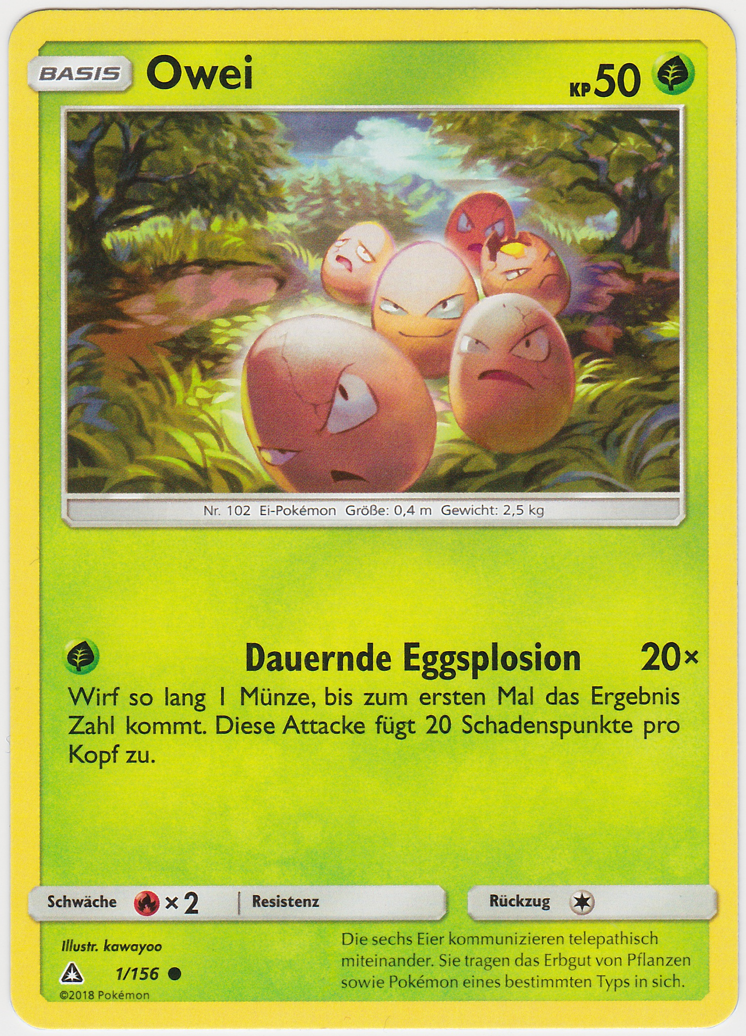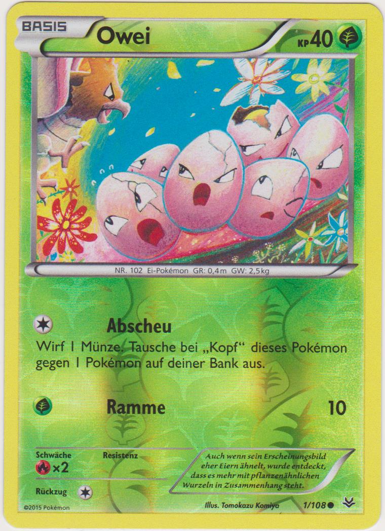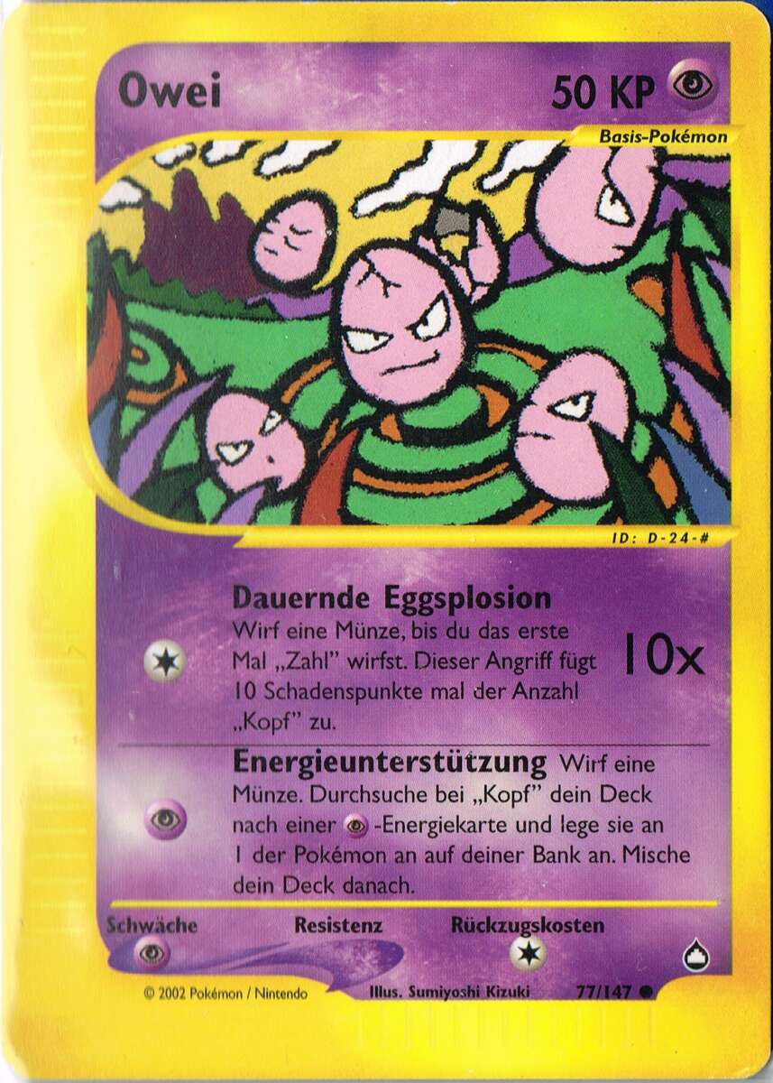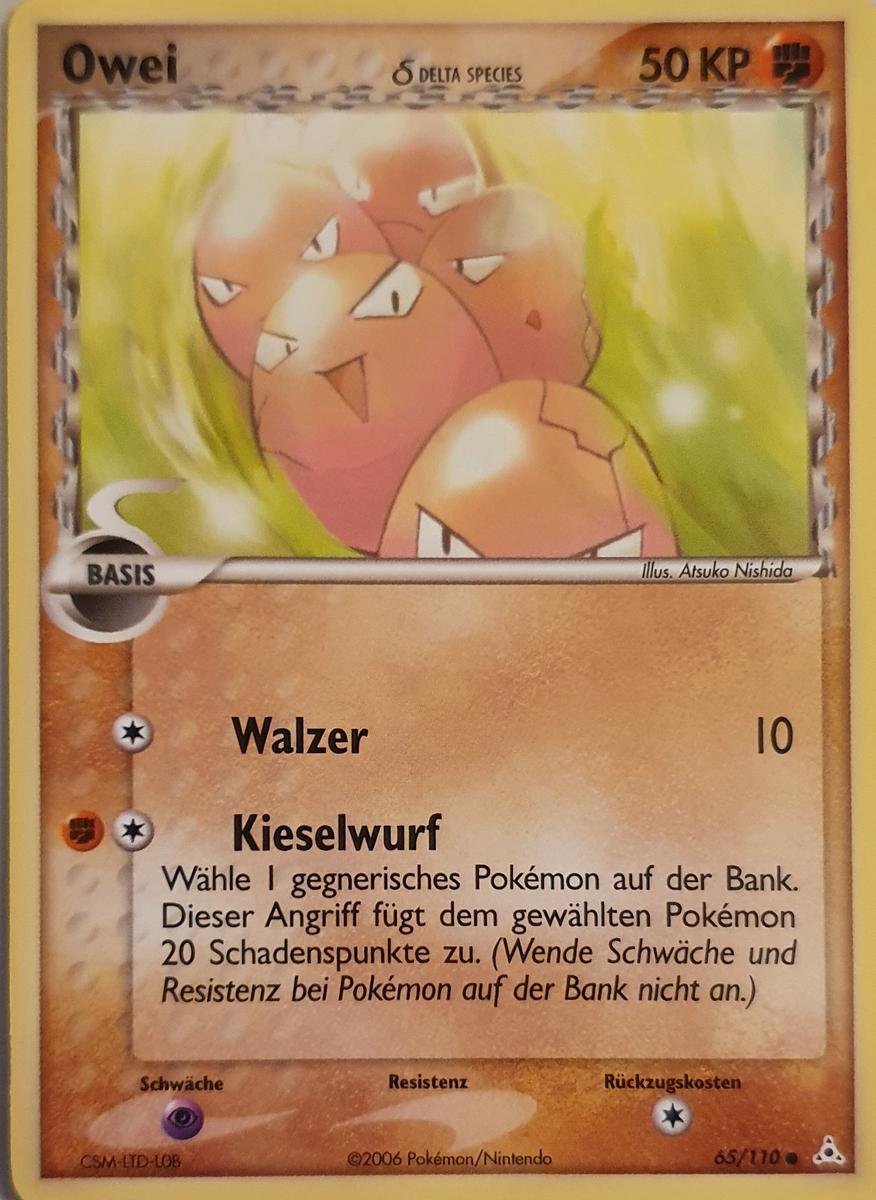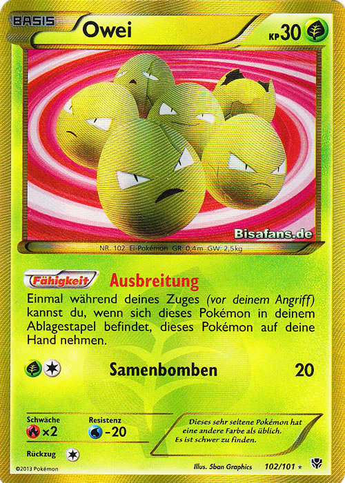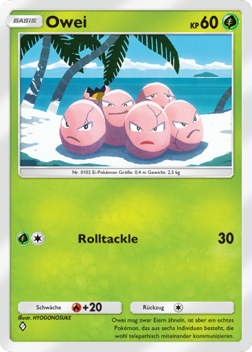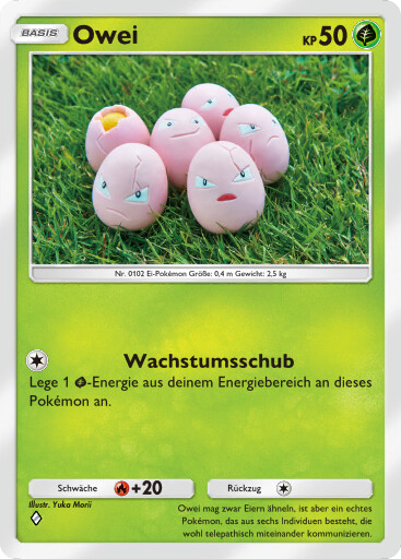 - RS Dieses POKéMON besteht aus sechs Eiern, die ein engmaschiges Netz bilden. Die sechs Eier ziehen sich gegenseitig an und drehen sich. Wenn die Eier Risse bekommen, steht OWEI kurz vor seiner Entwicklung.