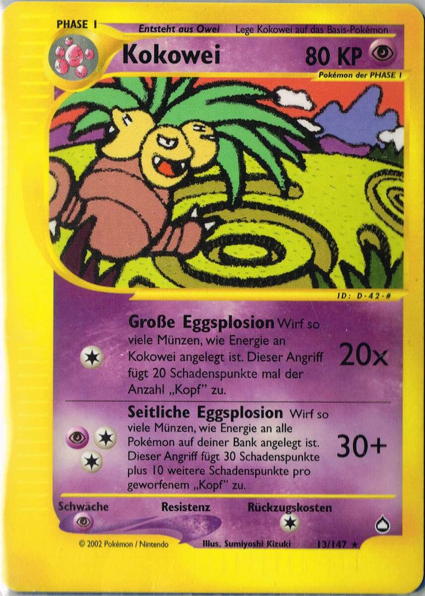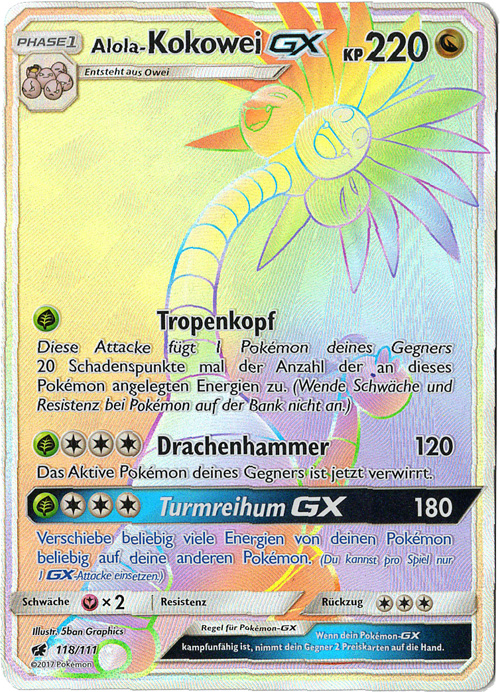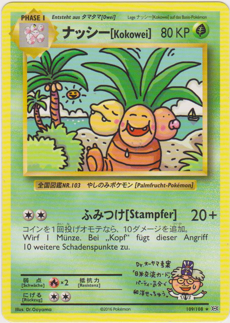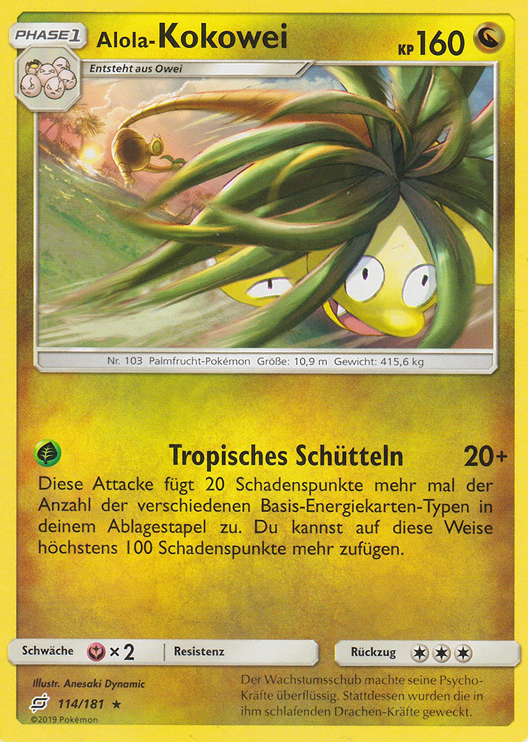 Durch die Kombination von Reiche Ernte und Bizarroraum hat Alola-Kokowei eine Nische, in der nur das offensiv allerdings deutlich harmlosere Trombork eine direkte Konkurrenz darstellt. Mit Draco Meteor und Blättersturm hat es zwei starke STABs, deren negative Zusatzeffekte durch Krafttausch an den Gegner weitergegeben werden können. Schlafpuder ist eine Alternative, die eventuelle Konter des Gegners lahmlegen kann, allerdings ist die Attacke sehr unzuverlässig. Die EVs garantieren das Überleben von Kapu-Falas ungeboosteter Mondgewalt, und lassen Kokowei zu einer hohen Wahrscheinlichkeit auch Alola-Knoggas Flammenblitz überstehen.