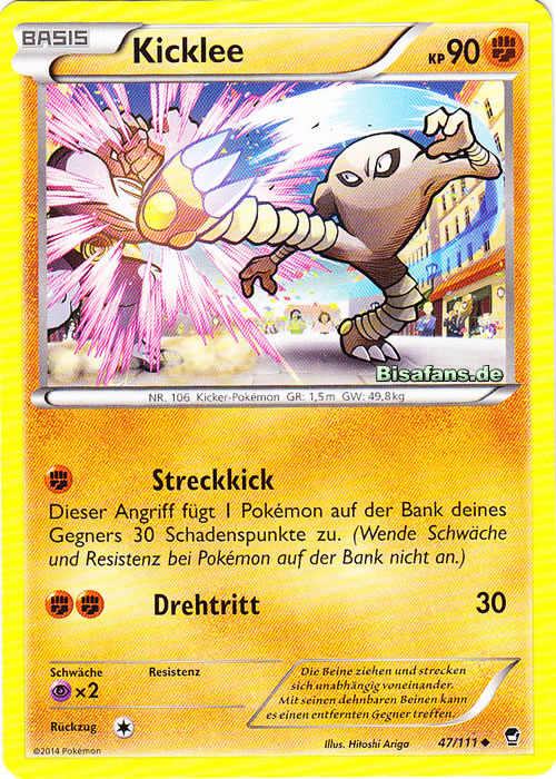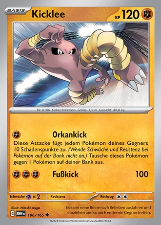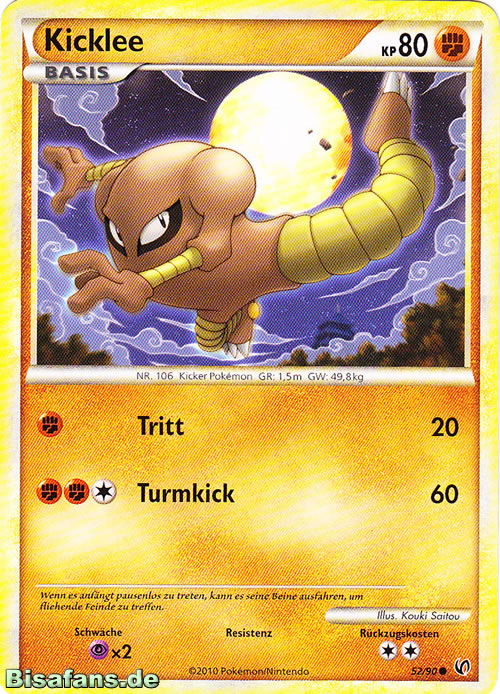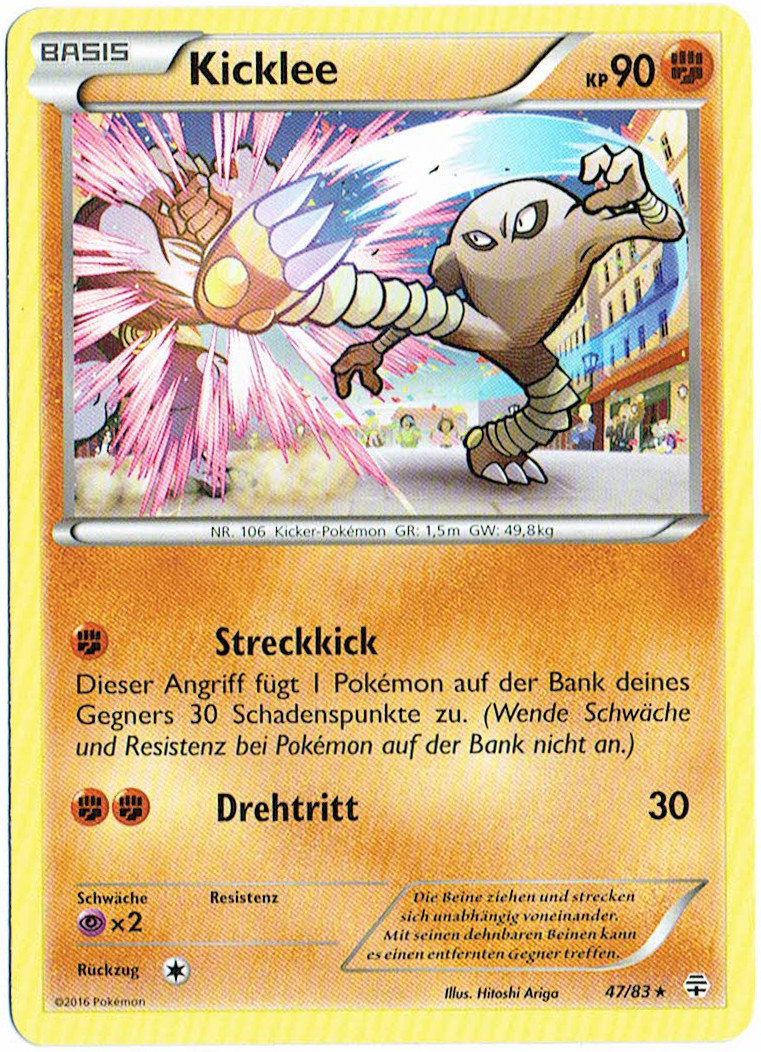 - S Dieses Pokémon ist auch als "Kick-Dämon" bekannt. Es kann bei Bedarf seine flexiblen Beine im Kampf verlängern oder verkürzen.