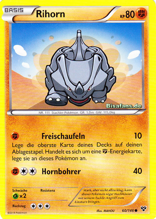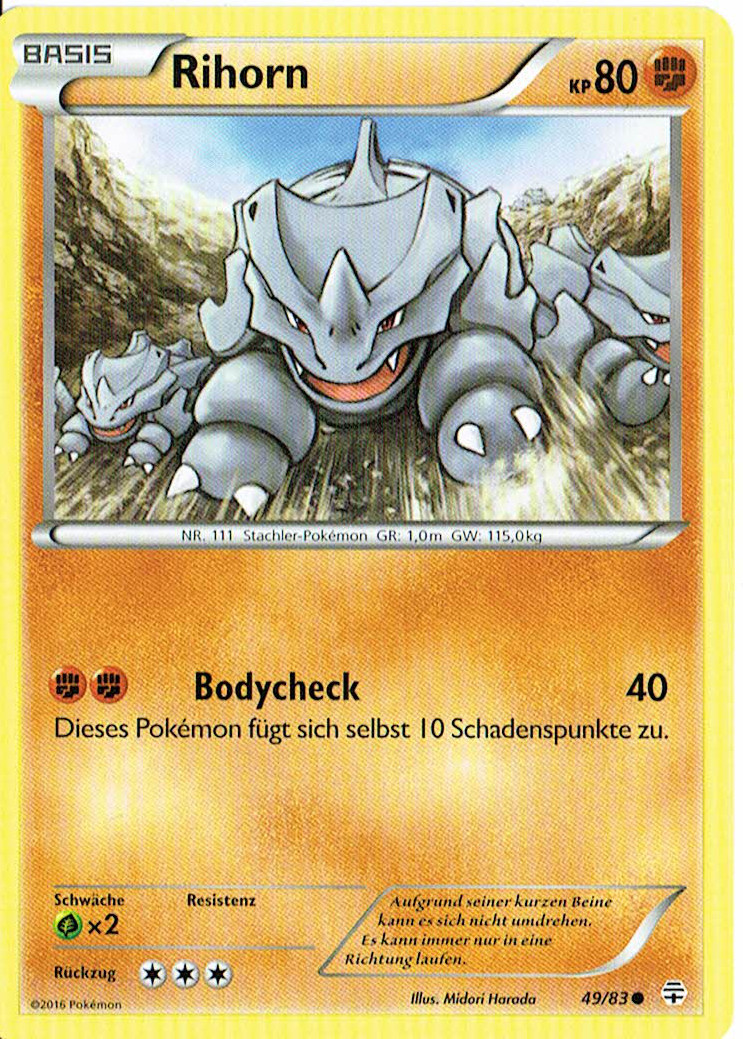 - X Stark, aber nicht allzu klug, kann dieses Pokémon sogar Hochhäuser mit seinem Tackle-Angriff zum Einsturz bringen.