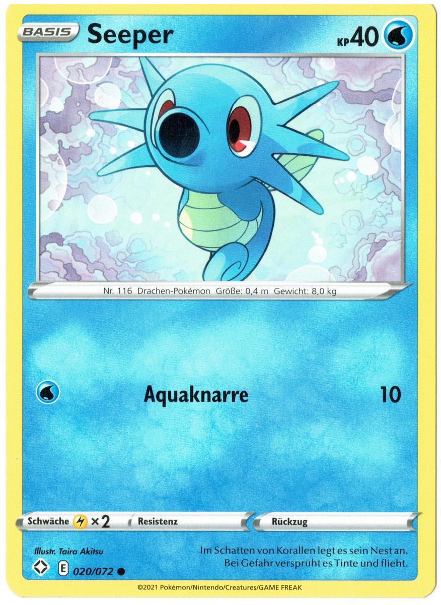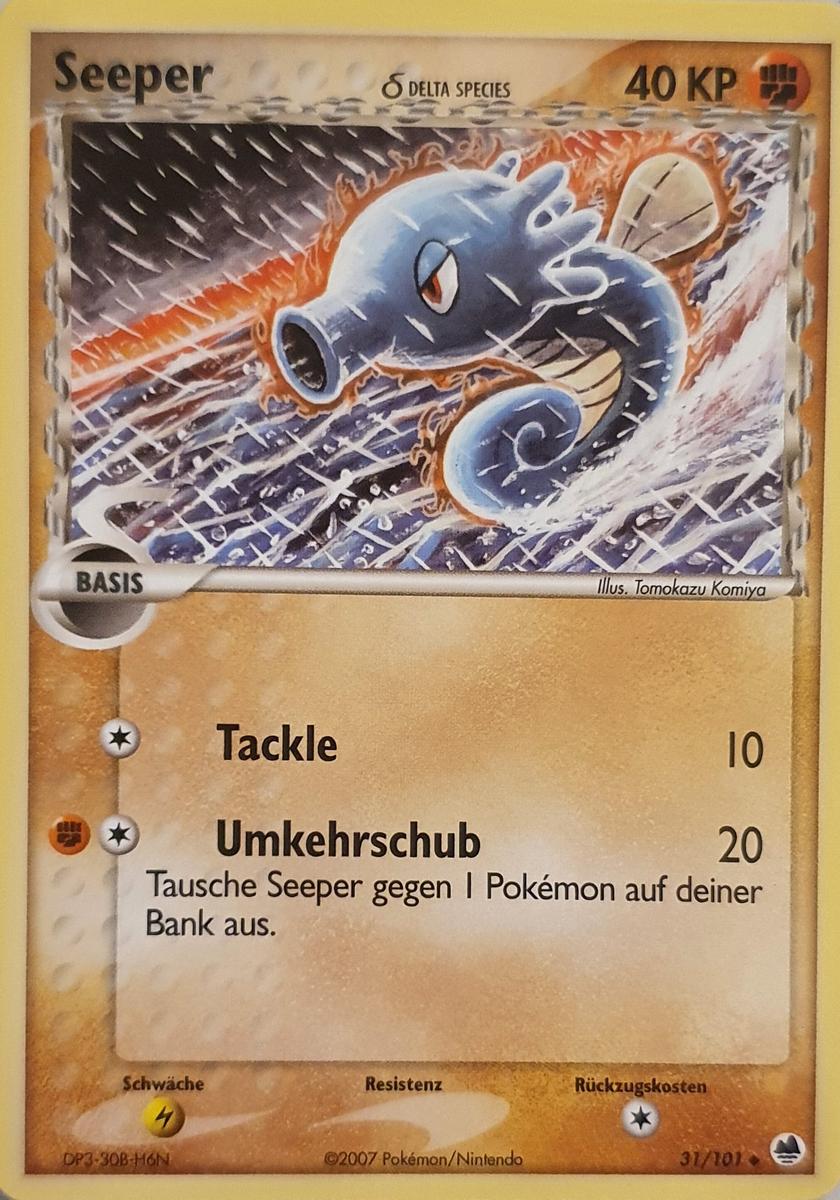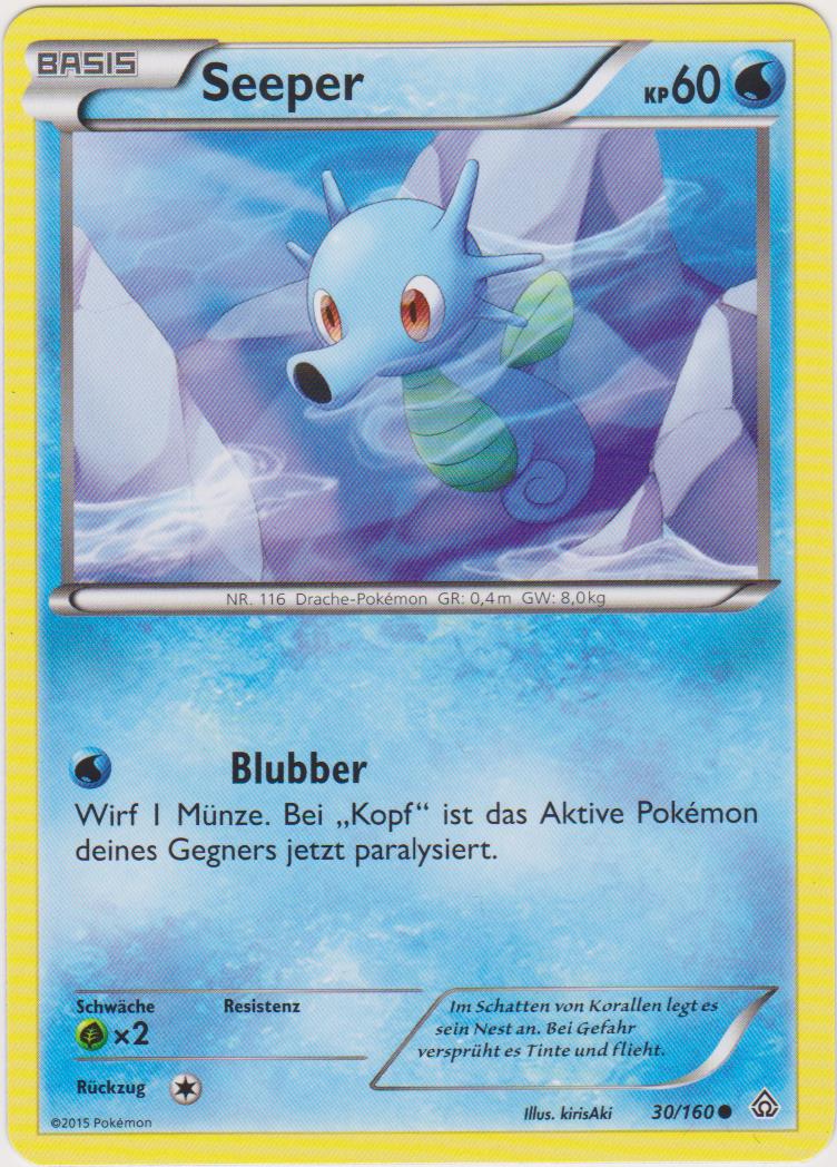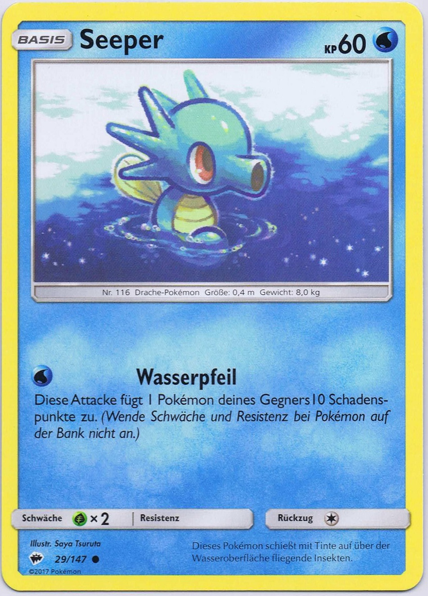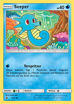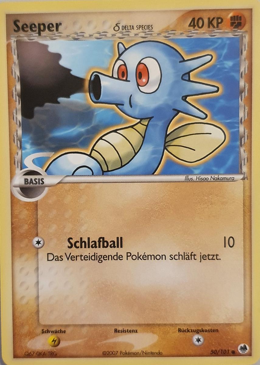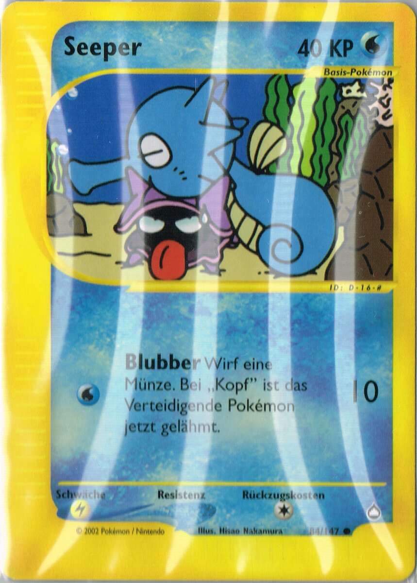 - OR Seeper ernährt sich von kleinen Insekten und dem Moos auf Steinen. Bei unruhiger See verankert sich dieses Pokémon mit seinem Schweif an Steinen oder Korallen, damit es nicht weggespült wird.