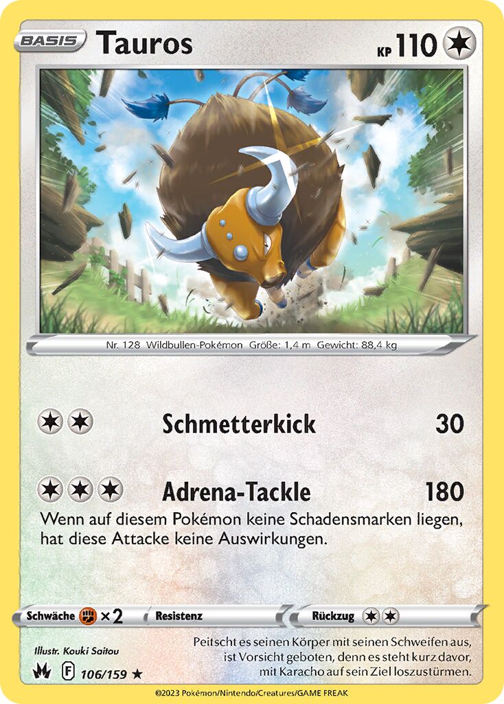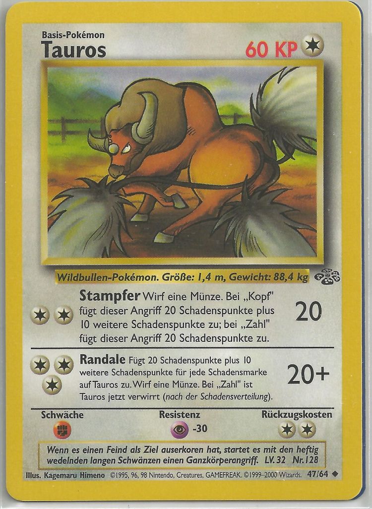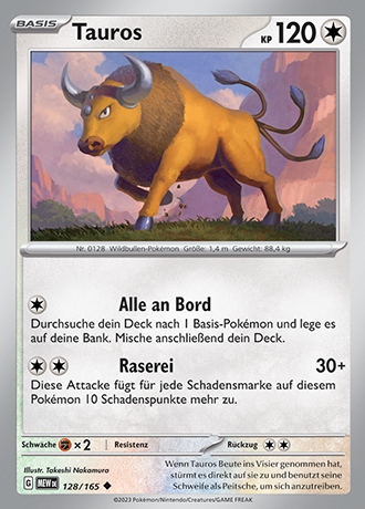 - S Dieses POKéMON ist nur zufrieden, wenn es kämpfen kann. Wenn TAUROS keinen Gegner findet, sucht es sich robuste Bäume und haut sie um, um sich abzureagieren.