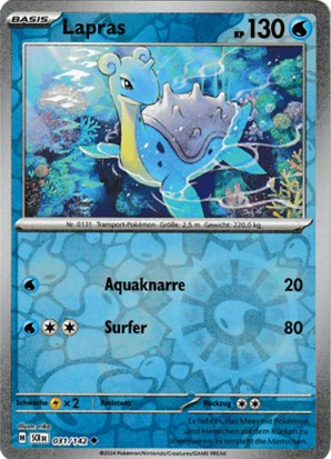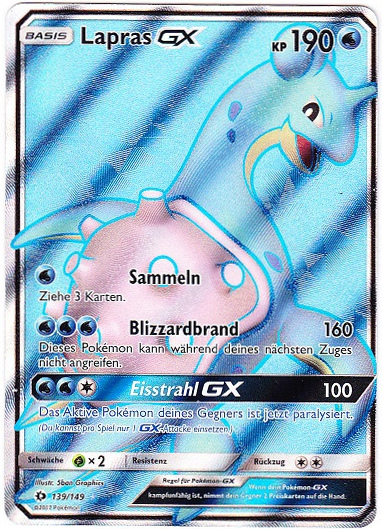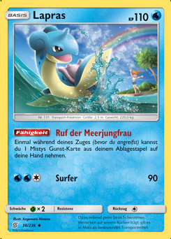 - S Dieses seltene Pokémon kann die menschliche Sprache verstehen. Auf seinem Rücken trägt es sehr gerne Menschen über das Wasser.