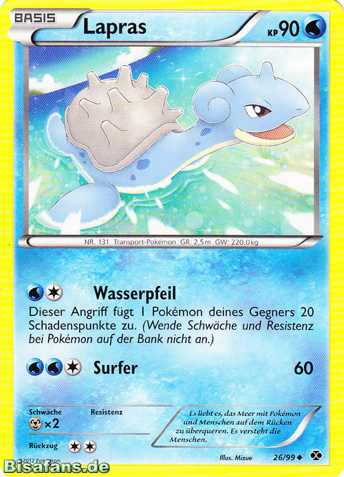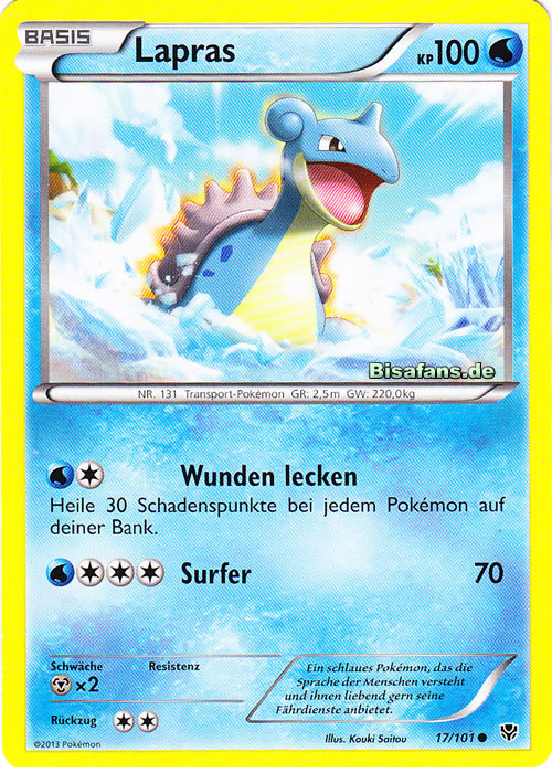 - RB Dieses Pokémon wurde von Jägern fast ausgerottet. Es kann Personen über das Wasser transportieren.