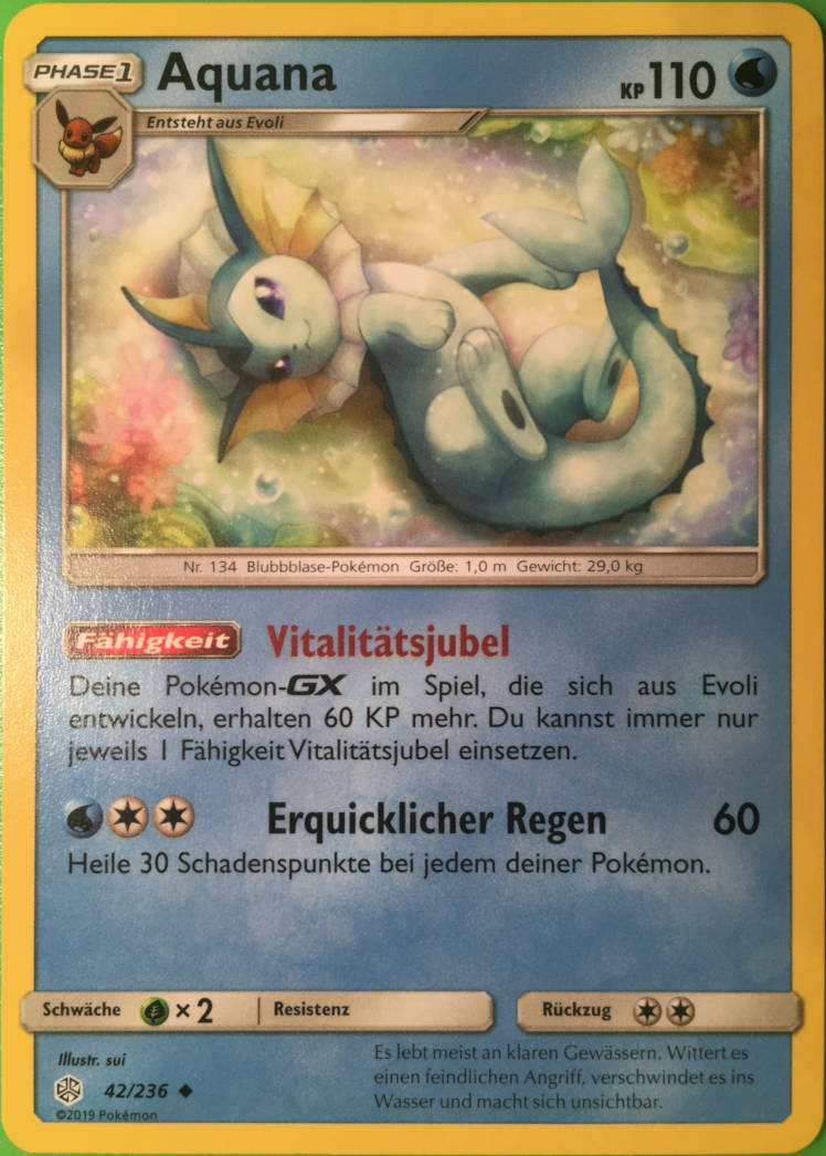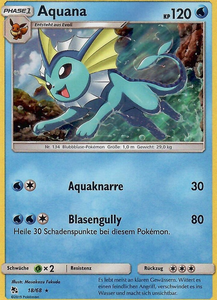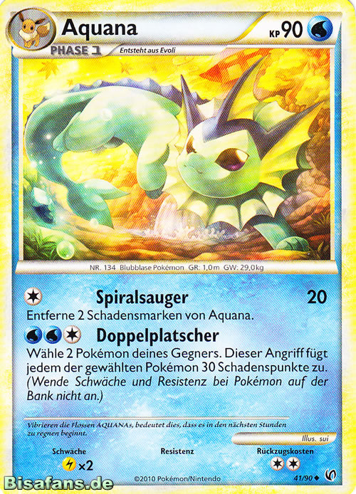 - AS Aquana hat eine spontane Mutation durchlaufen. Ihm sind Flossen und Kiemen gewachsen. Dadurch kann es unter Wasser leben. Dieses Pokémon kann Wasser nach Belieben manipulieren.