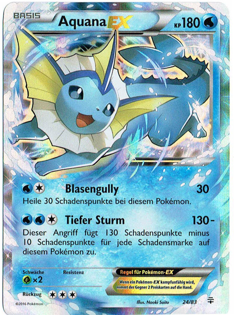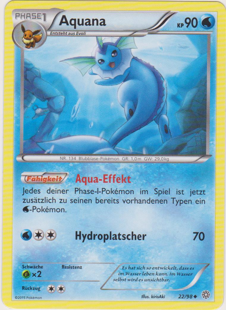 - OR Aquana hat eine spontane Mutation durchgemacht und ihm sind Flossen und Kiemen gewachsen. Dadurch kann es unter Wasser leben. Dieses Pokémon kann Wasser nach Belieben manipulieren.