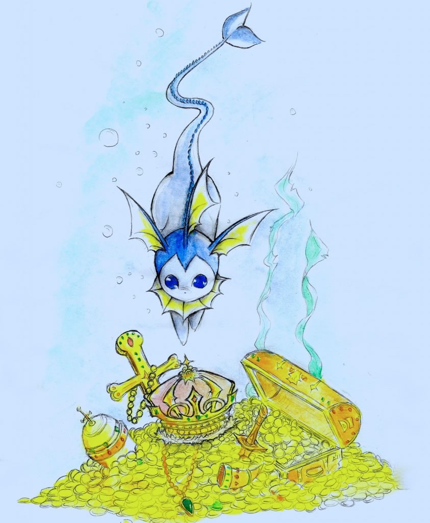 - M Es wird eins mit dem Wasser und somit unsichtbar. So wartet es heimlich, still und leise auf Fisch-Pokémon, die es sich als Beute fängt.