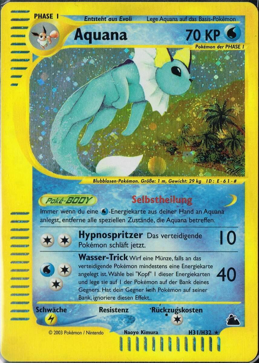 - RS AQUANA hat eine spontane Mutation durchlaufen. Ihm sind Flossen und Kiemen gewachsen. Dadurch kann es unter Wasser leben. Dieses POKéMON kann Wasser nach Belieben manipulieren.