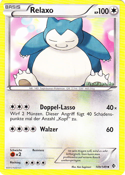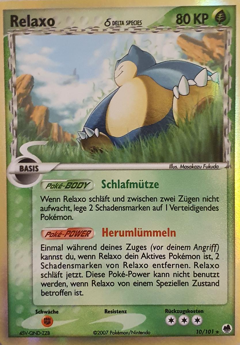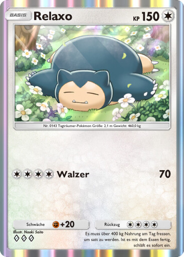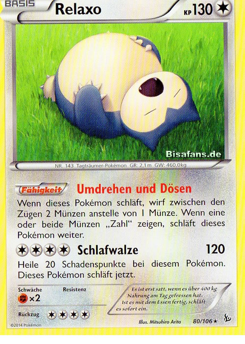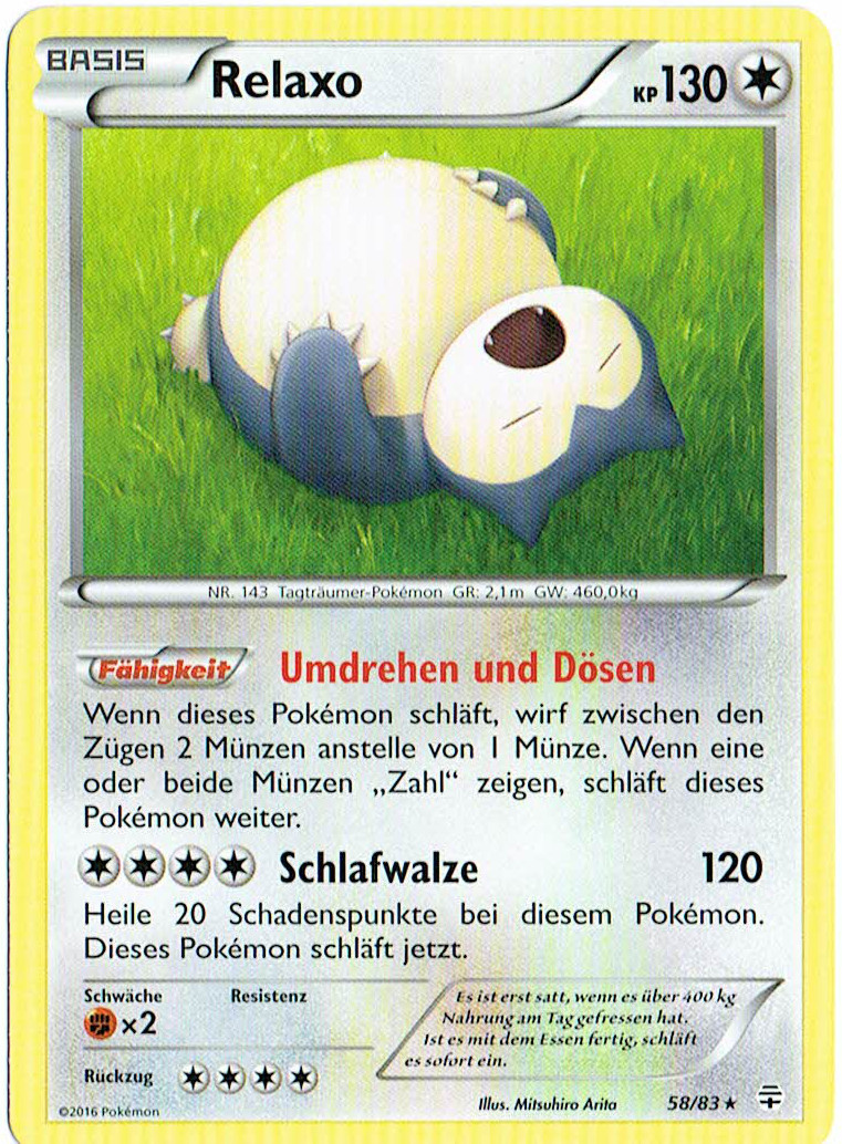 Relaxo kann durch seinen immensen Bulk meistens problemlos Bauchtrommel einsetzen und danach alles mindestens 2HKOen. Die 50% KP, die es durch Bauchtrommel verliert, werden durch die Giefebeere in Kombination mit der Fähigkeit Völlerei direkt wieder ausgeglichen. Rückkehr dient als STAB. Erdbeben dient der Coverage bzw. um neutralen Schaden, vor allem gegen Geister wie Gengar und Mimikyu anzurichten. Alternativ kann man auch Flammenwurf spielen, womit man das 1v1 gegen Katagami gewinnt. Mit Aufbereitung hat man die Möglichkeit, sich die Giefebeere wiederzuholen. 244 KP-EVs bringen Relaxo auf eine gerade Anzahl an KP, sodass sich die Giefebeere direkt nach Bauchtrommel aktiviert. Mit 52 SpV-EVs lebt es Kapu-Falas Psychokinese ohne Leben-Orb, kann sich boosten und anschließend noch eine Psychokinese einstecken. Der Rest geht in die Verteidigung.