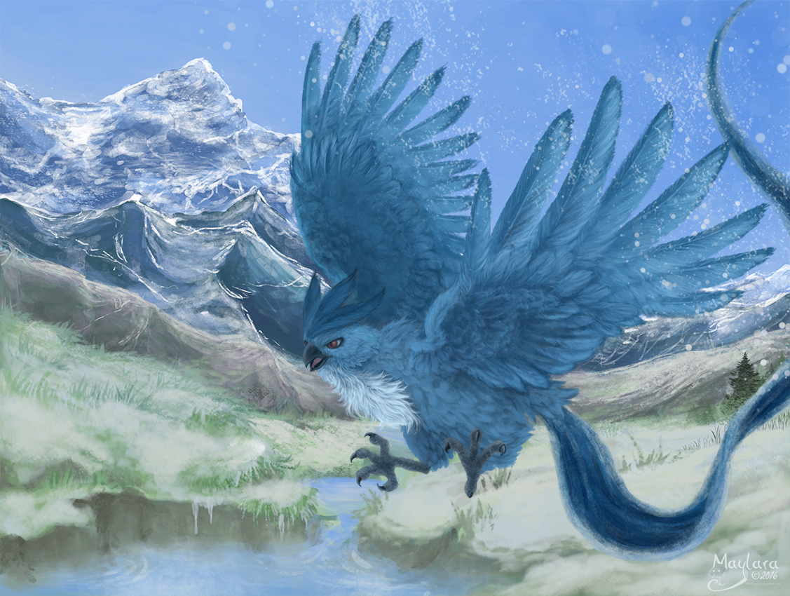 - SWKS Seine wunderschönen blauen Flügel sollen aus Eis bestehen. Es fliegt über schneebedeckte Berge, während sein langer Schweif hinter ihm flattert.