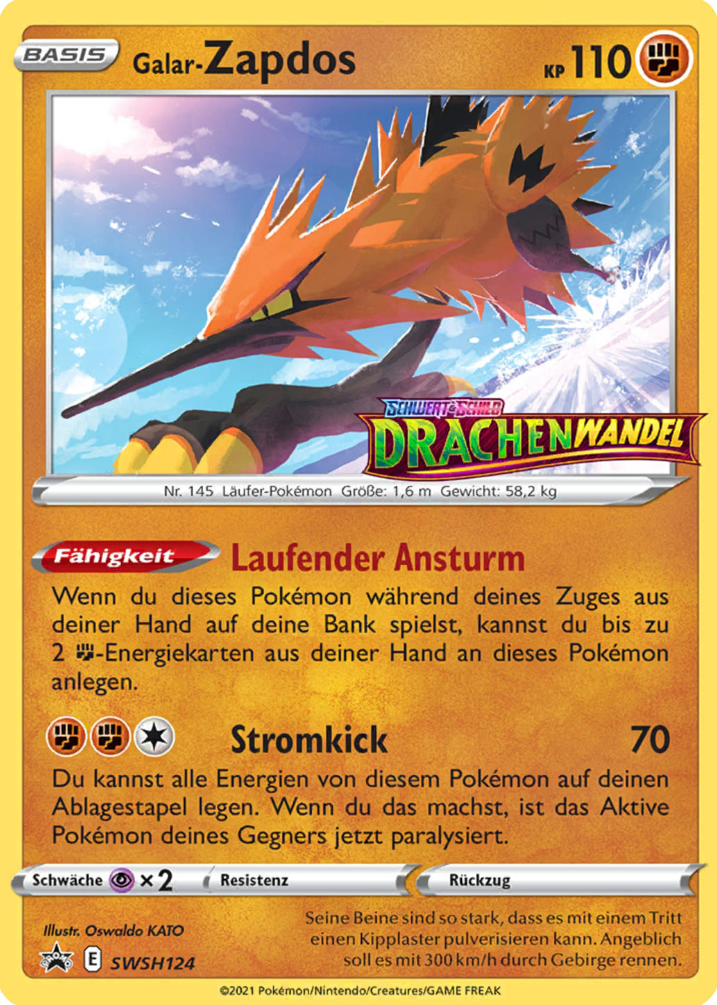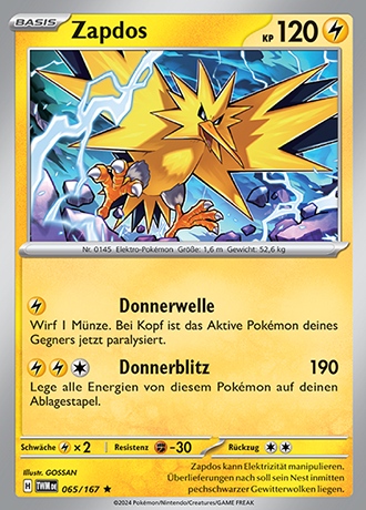 - SWKS Zapdos kann Elektrizität manipulieren. Überlieferungen nach soll sein Nest inmitten pechschwarzer Gewitterwolken liegen.