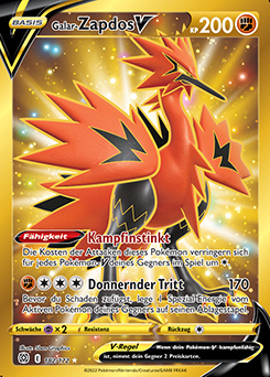 - S Dieses legendäre Vogel-Pokémon tritt mit einem gigantischen Gewitter in Erscheinung. Seine Schwanzfedern versprühen Funken.