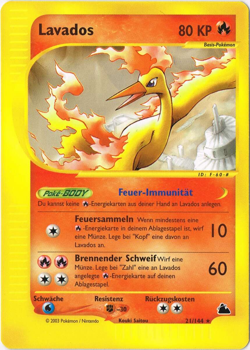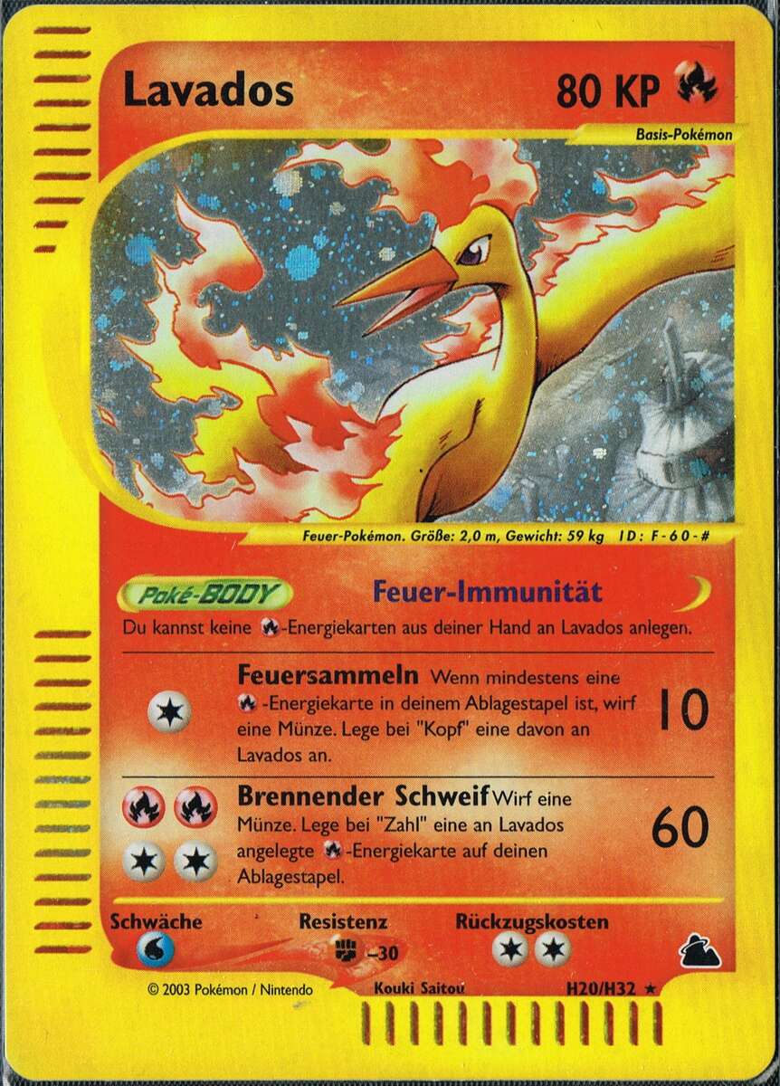 - RS LAVADOS ist ein legendäres Vogel-POKéMON, das Feuer manipulieren kann. Wenn es verletzt wird, taucht es seinen Körper in das Magma eines Vulkans, um sich zu verbrennen und selbst zu heilen.