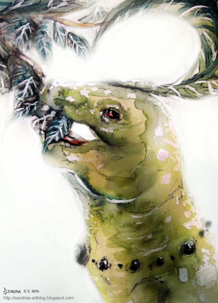 - SW Mit dem Blatt auf seinem Kopf bestimmt es die Temperatur und Feuchtigkeit. Es liebt Sonnenbäder.