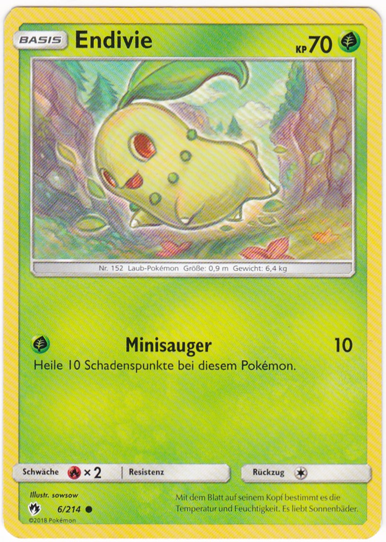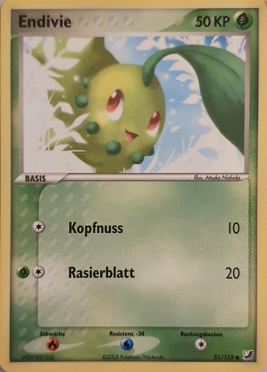 - AS Im Kampf wedelt Endivie mit seinem Blatt, um den Feind fernzuhalten. Von dem Blatt geht auch ein süßlicher Duft aus, der das gegnerische Pokémon im Kampf beruhigt und eine gemütliche, freundliche Atmosphäre schafft.