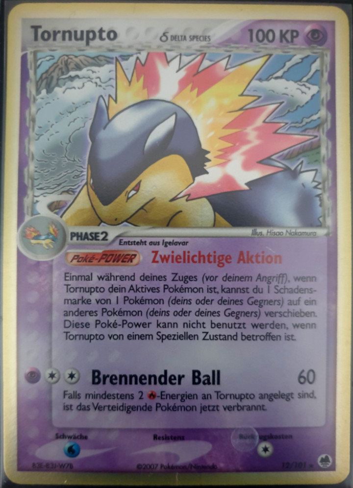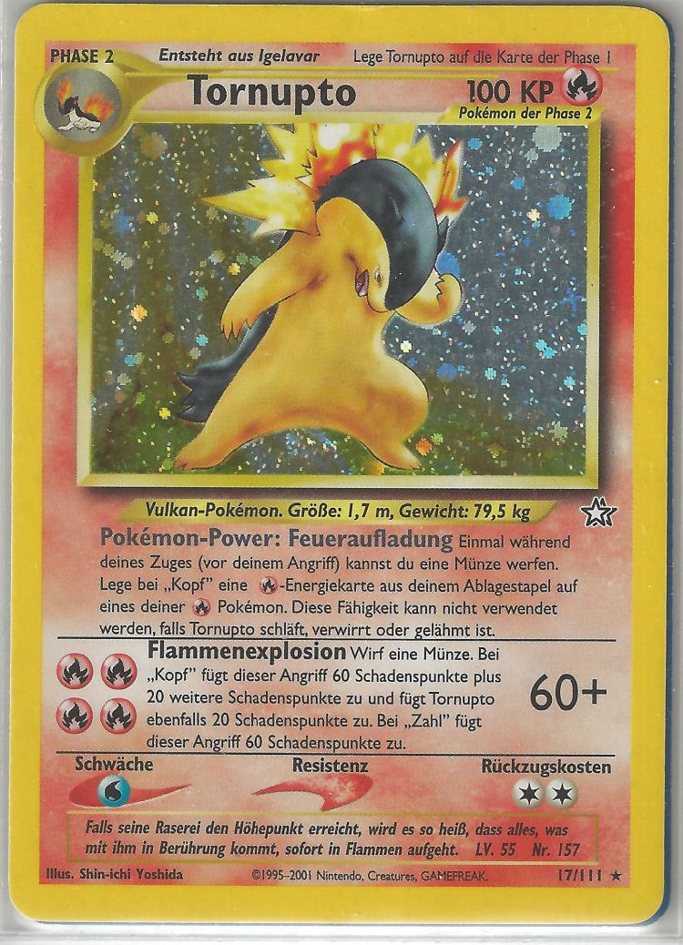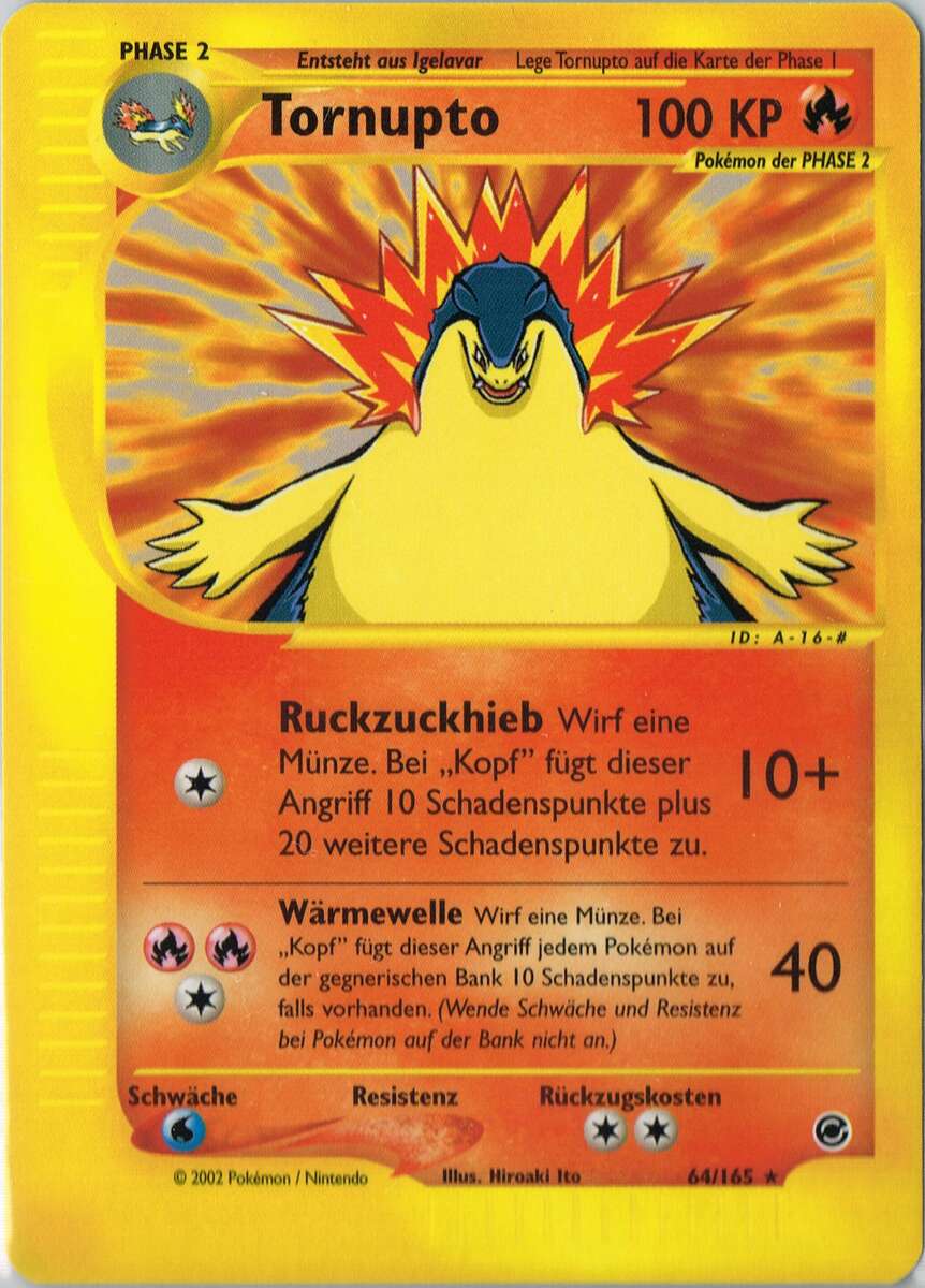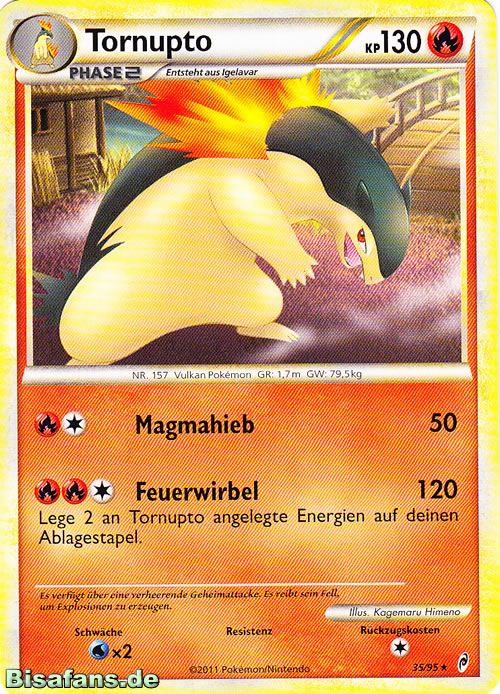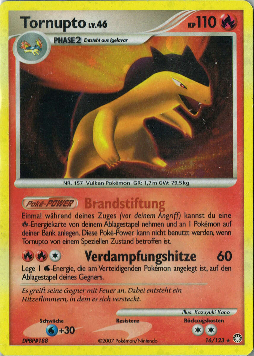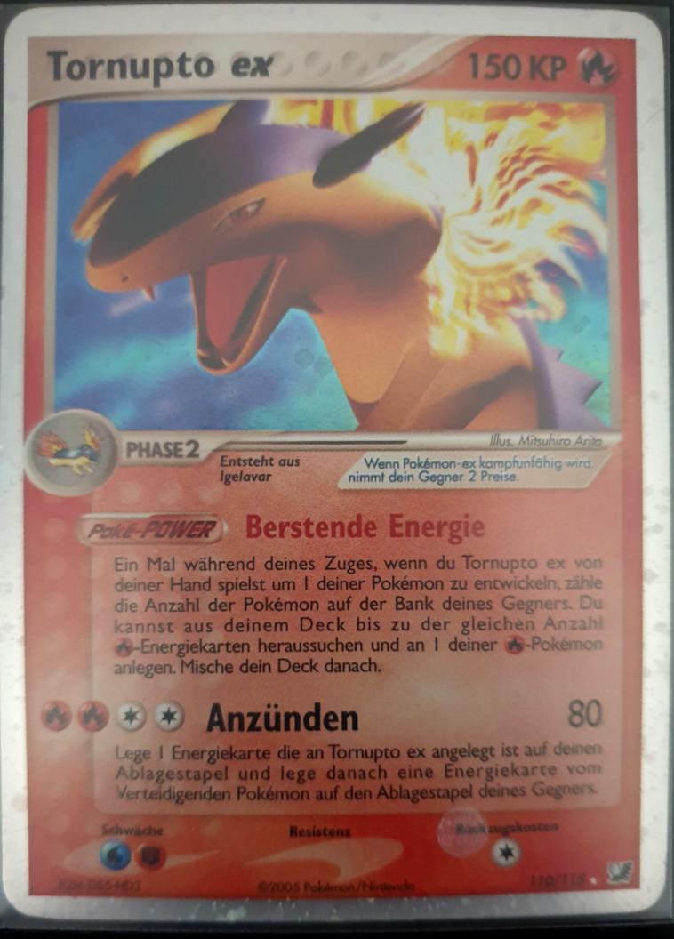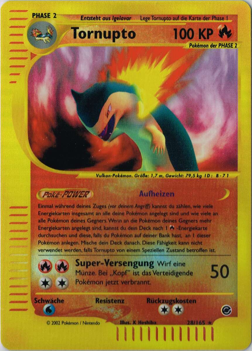 - RS TORNUPTO versteckt sich hinter einem flimmernden Hitzeschild, den es mit Hilfe seiner heißen Flammen erzeugt. Dieses POKéMON erzeugt Explosionen, die alles in Schutt und Asche legen.