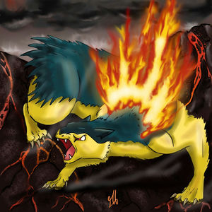 - K Es verfügt über eine verheerende Geheimattacke, bei der es sein flammendes Fell reibt, um so Explosionen zu erzeugen.