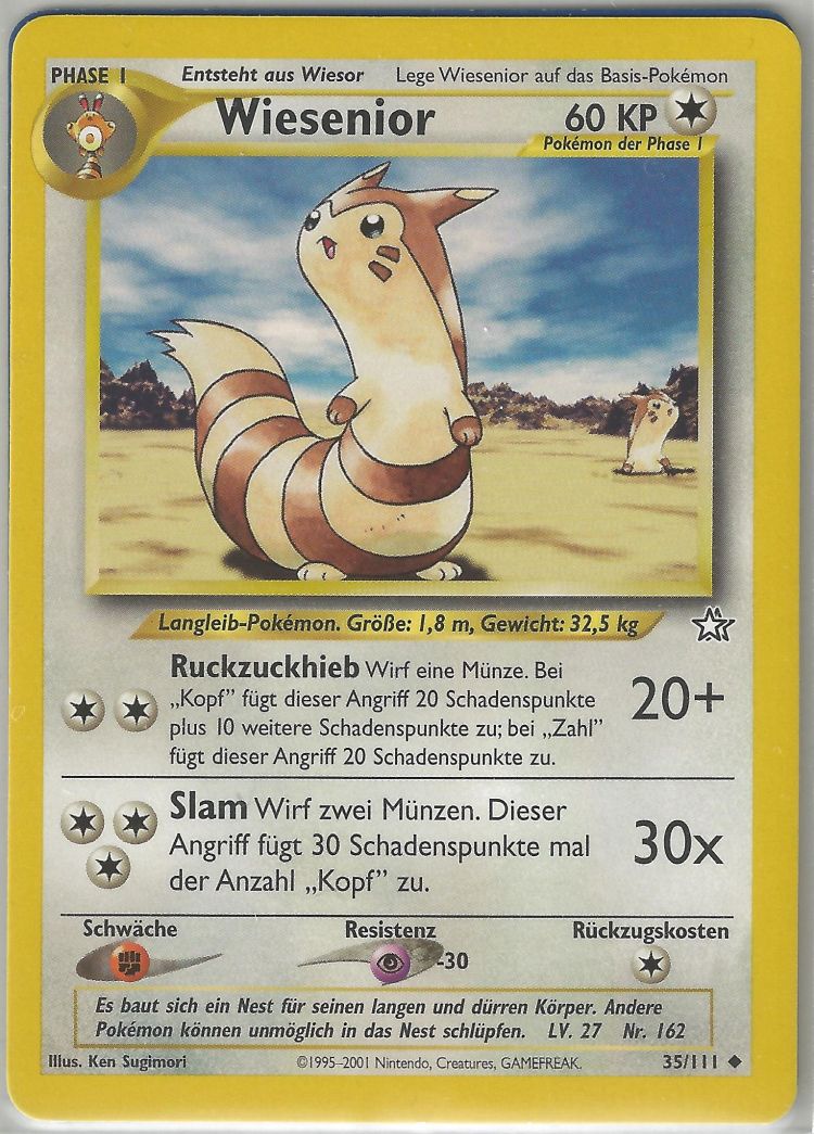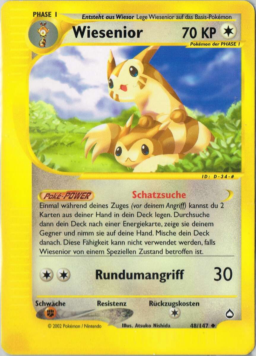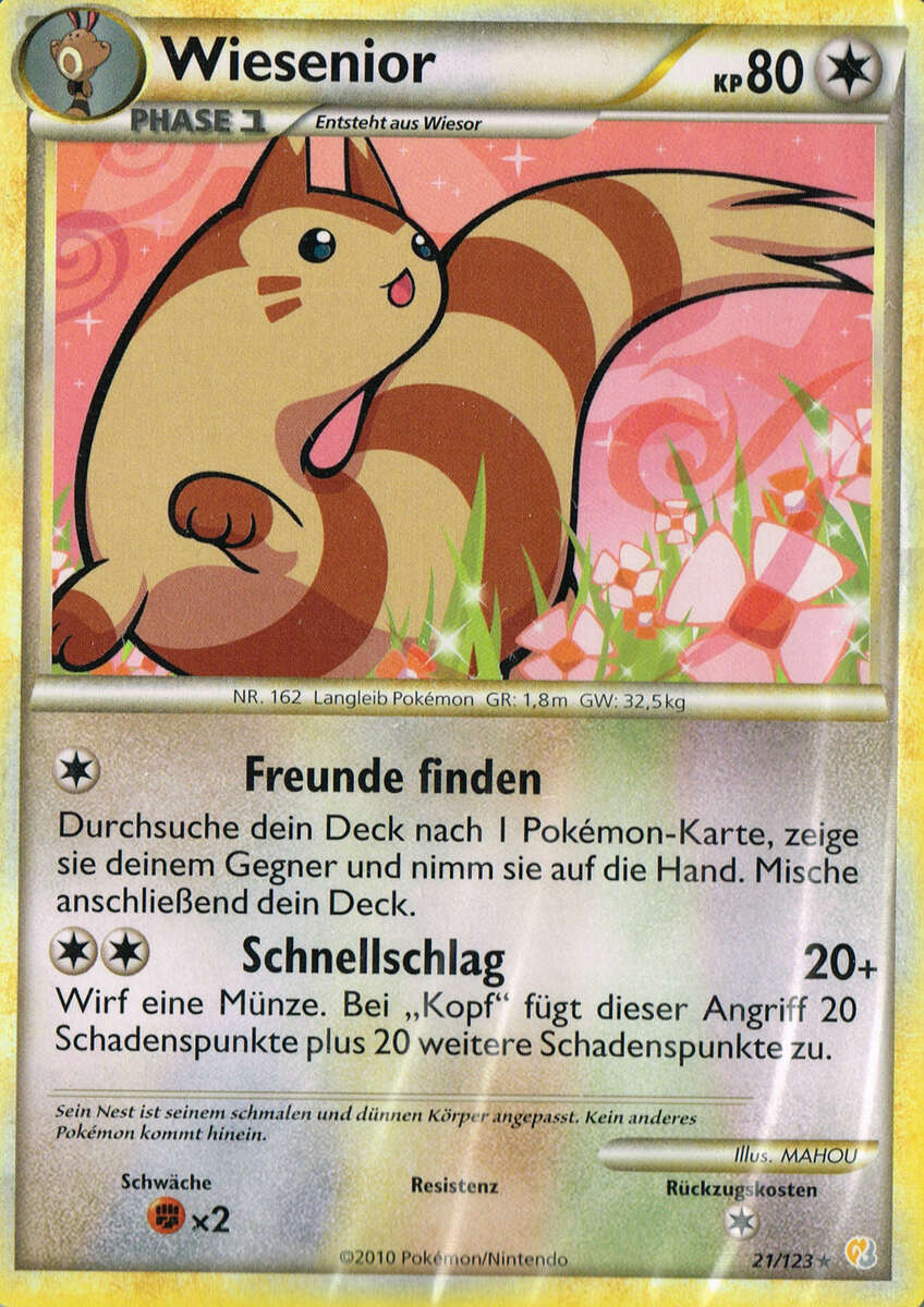 - RS WIESENIOR ist sehr schlank. Wenn es angegriffen wird, kann es sich durch enge Zwischenräume schlängeln und entkommen. Trotz seiner kurzen Gliedmaßen ist dieses POKéMON sehr wendig und flink.