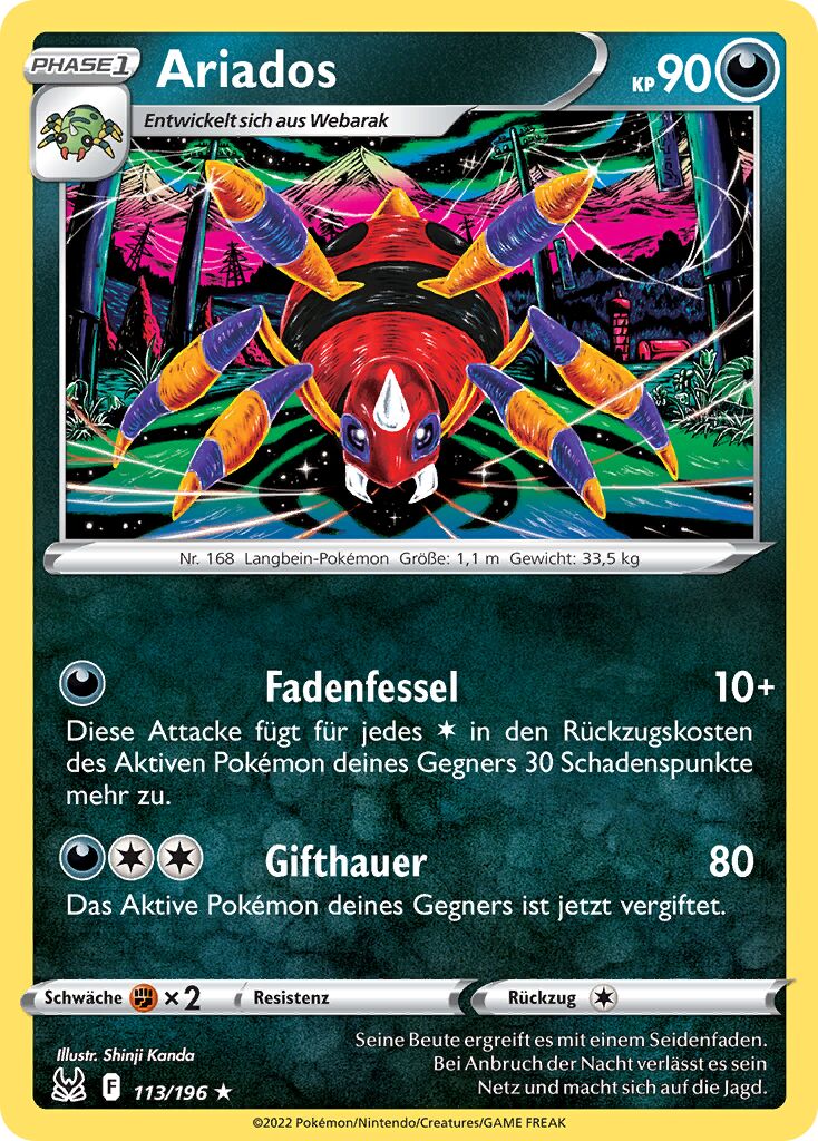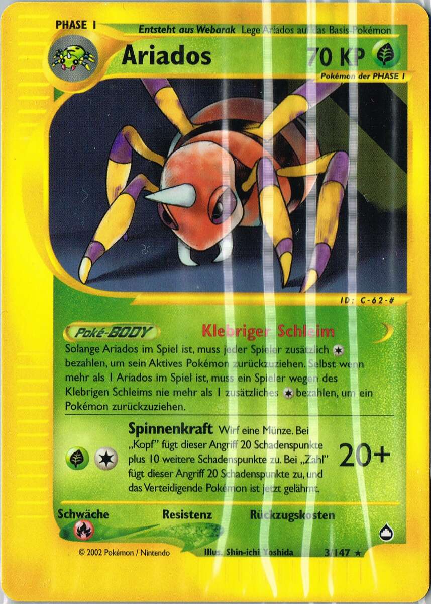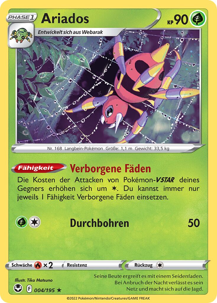 - RS ARIADOS hat kleine hakenförmige Krallen an seinen Füßen. Damit kann es an Decken und Wänden entlang flitzen. Dieses POKéMON erdrückt seine Gegner mit starkem, dünnem Seidenfaden.