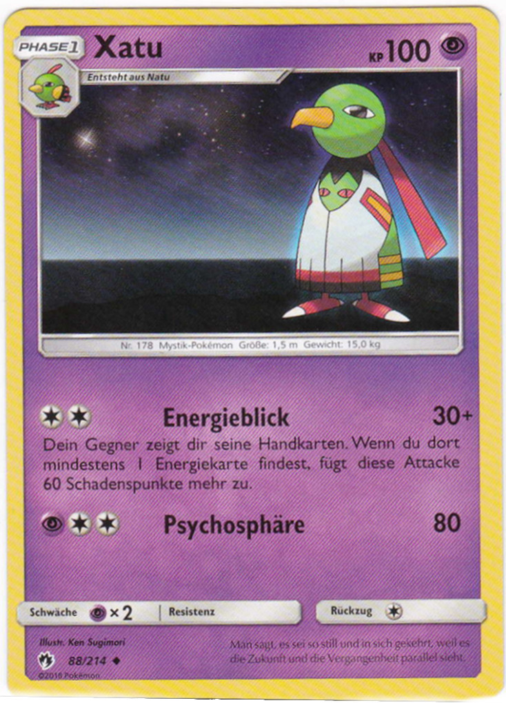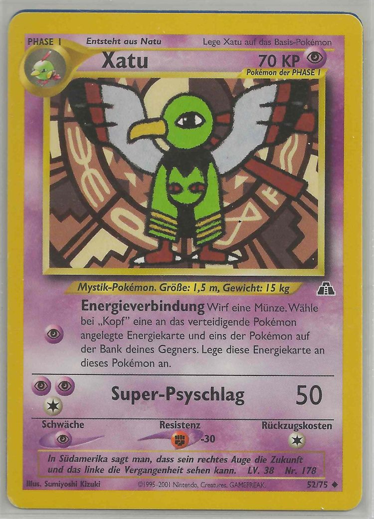 - AS Xatu steht den ganzen Tag bewegungslos herum und starrt die Sonne an. Einige Menschen verehren es als ein mystisches Pokémon. Sie glauben, dass Xatu in die Zukunft sehen könne.