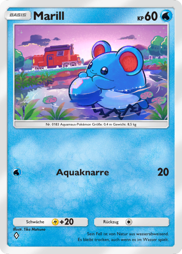 - AS Wenn es am Ufer eines reißenden Flusses fischt, wickelt Marill seinen Schweif um einen Baumstamm. Der Schweif dieses Pokémon ist flexibel und elastisch, sodass es ihn ausdehnen kann.