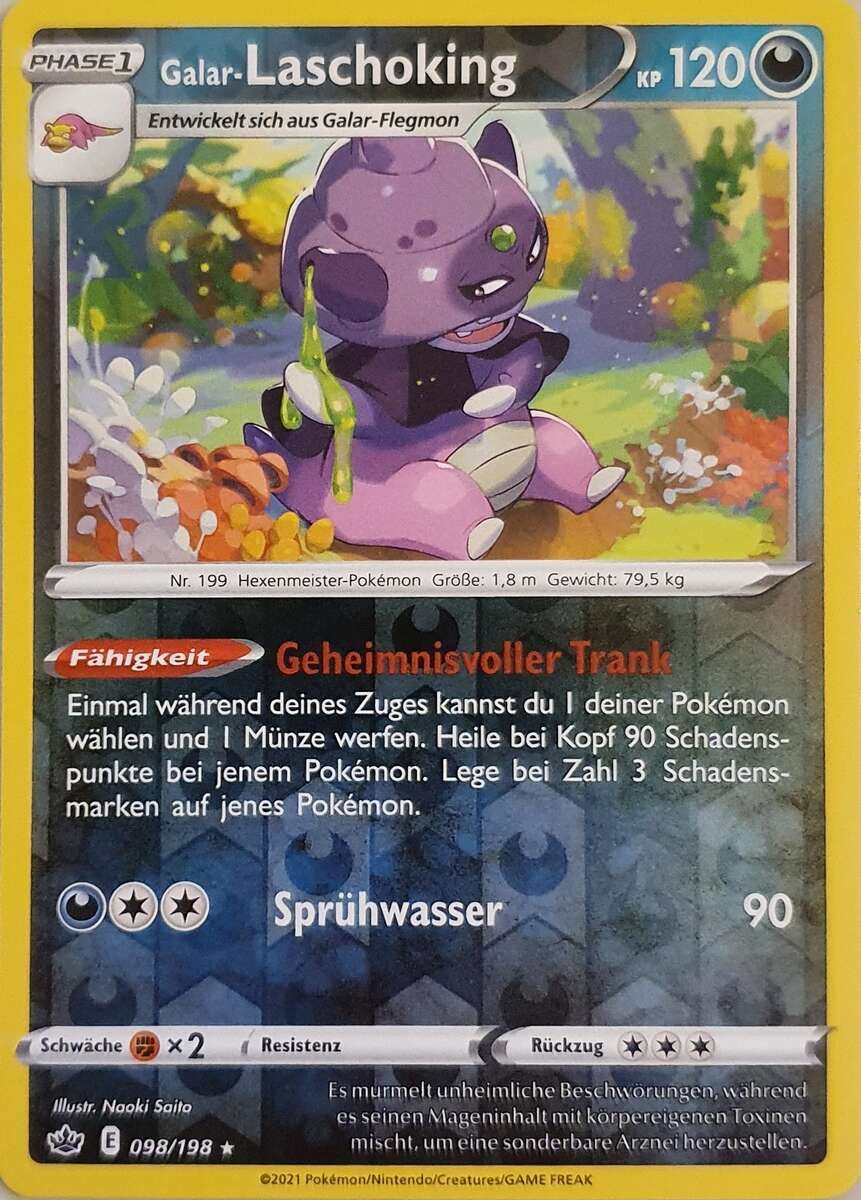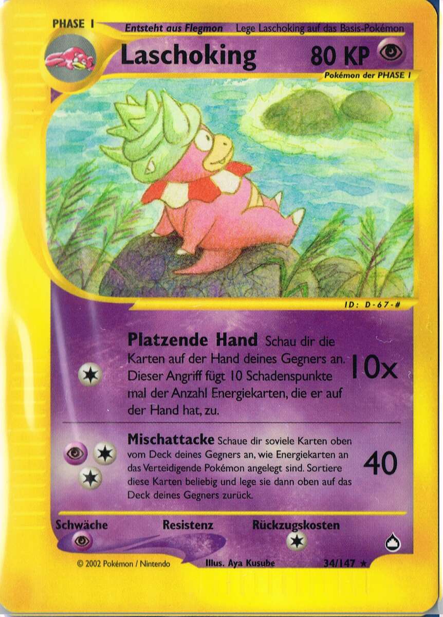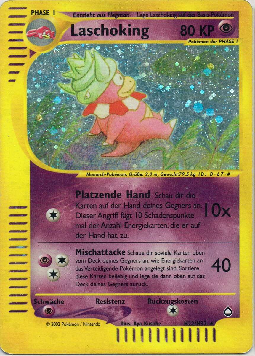 - GO Laschoking betreibt jeden Tag Forschung, um die Geheimnisse der Welt zu lüften. Dieses Pokémon vergisst aber alles, was es bereits herausgefunden hat, wenn das Muschas auf seinem Kopf abfällt.