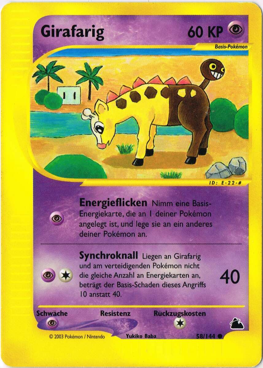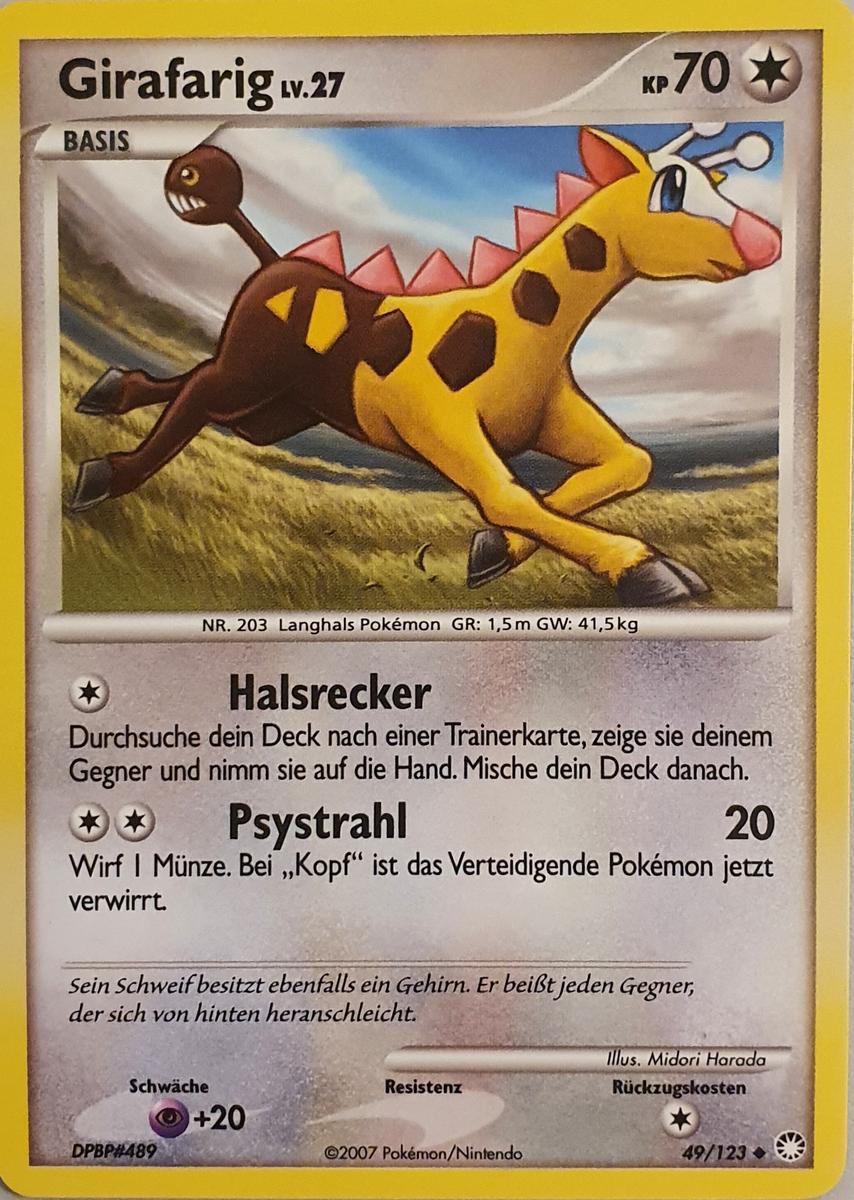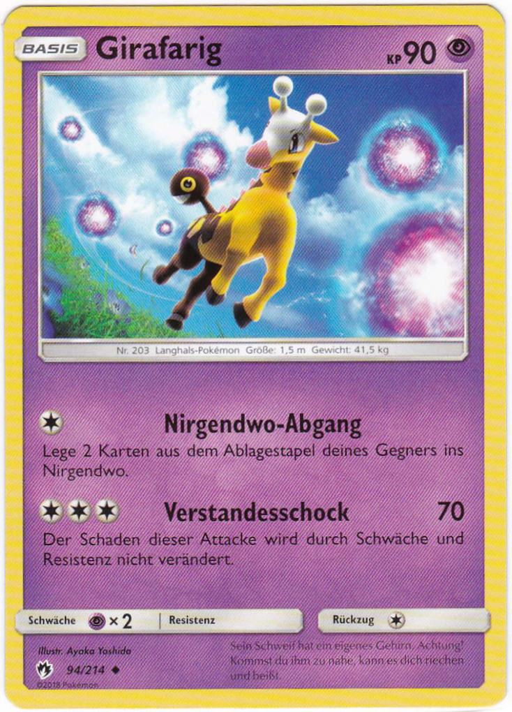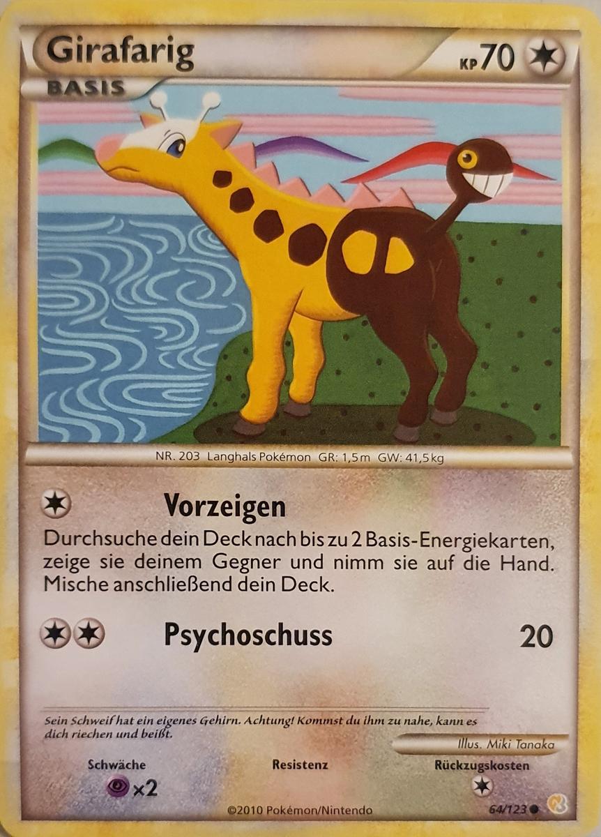 - R Der Kopf an GIRAFARIGs Hinterteil hat ein eigenes Gehirn. Er reagiert mit Angriffen auf Gerüche und Geräusche. Wenn man sich diesem POKéMON von hinten nähert, könnte der hintere Kopf plötzlich vorschnellen und zubeißen.