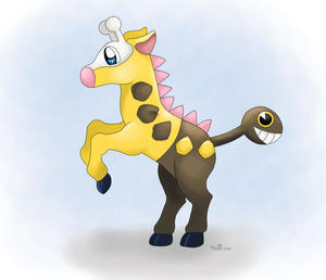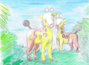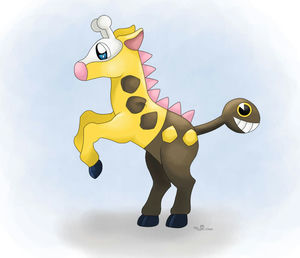 - OR Der Kopf an Girafarigs Hinterteil hat ein eigenes Gehirn. Er reagiert mit Angriffen auf Gerüche und Geräusche. Wenn man sich diesem Pokémon von hinten nähert, könnte der hintere Kopf plötzlich vorschnellen und zubeißen.