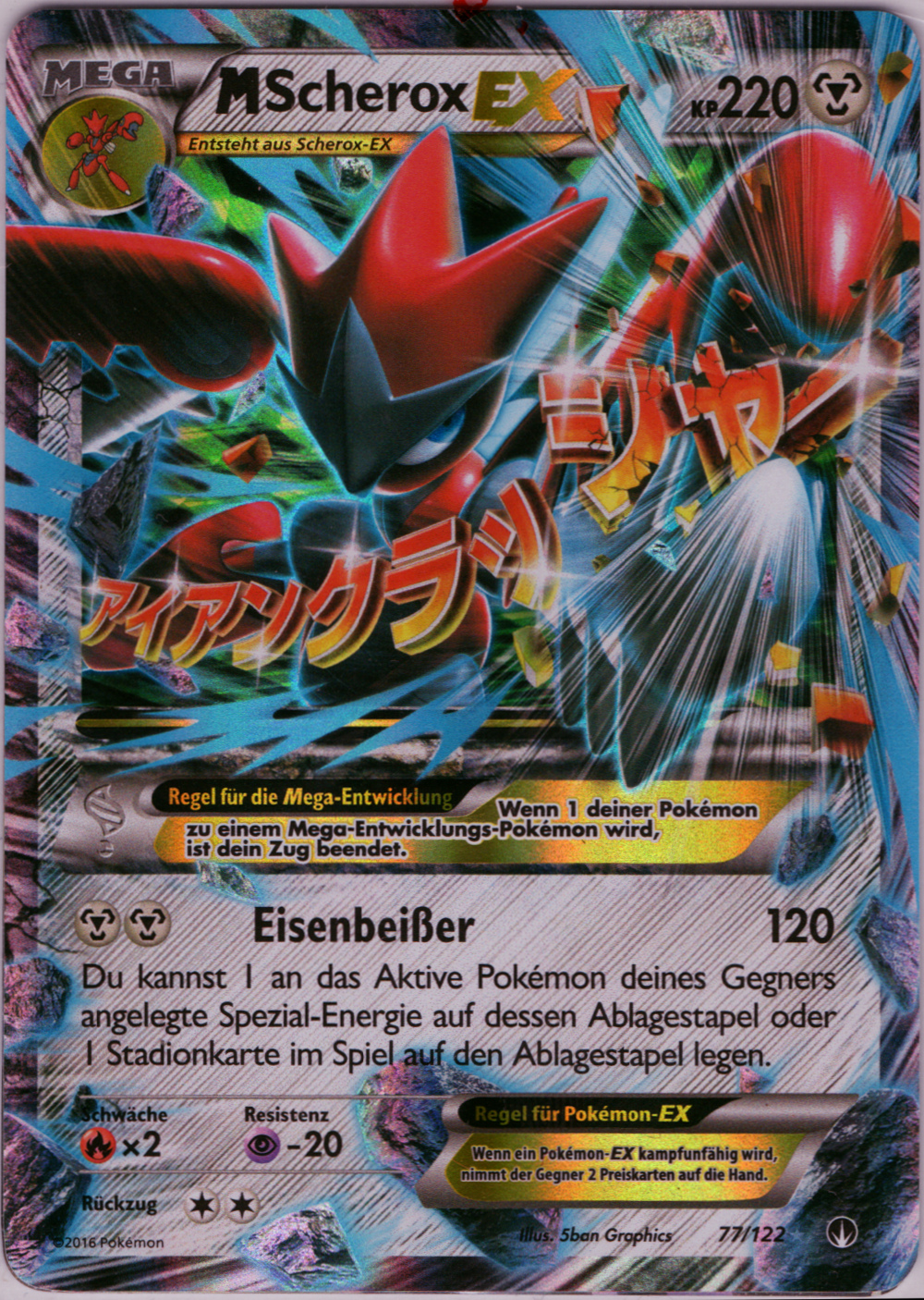 - X Dieses Pokémon kann mit seinen stählernen Scheren jeden harten Gegenstand mühelos zermalmen.