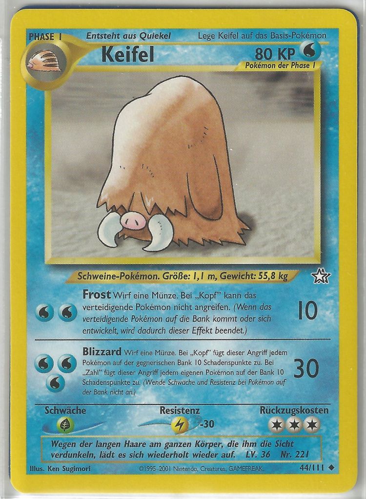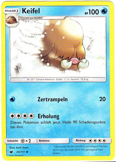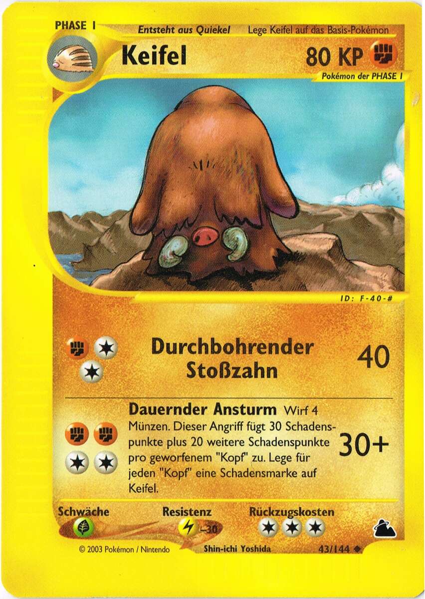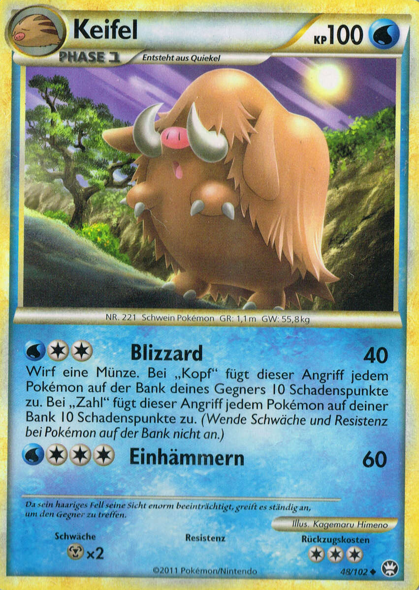 - OR Keifel hat ein dichtes Fell aus langen Haaren. Dadurch ist es gegen eisige Kälte gewappnet. Dieses Pokémon benutzt seine Hauer, um an Nahrung zu gelangen, die unter dem Eis eingeschlossen ist.