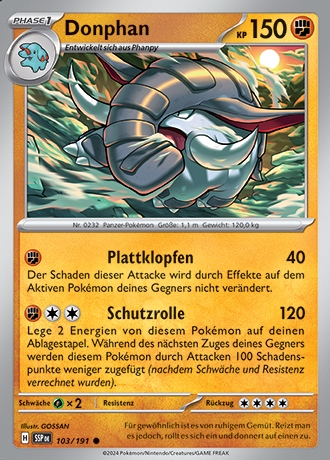 - S DONPHAN kann mit seinem harten Körper sogar ein Haus zerstören. Mit seiner imposanten Kraft hilft dieses POKéMON dabei, Erdrutsche aus dem Weg zu räumen, die Bergpfade versperren.