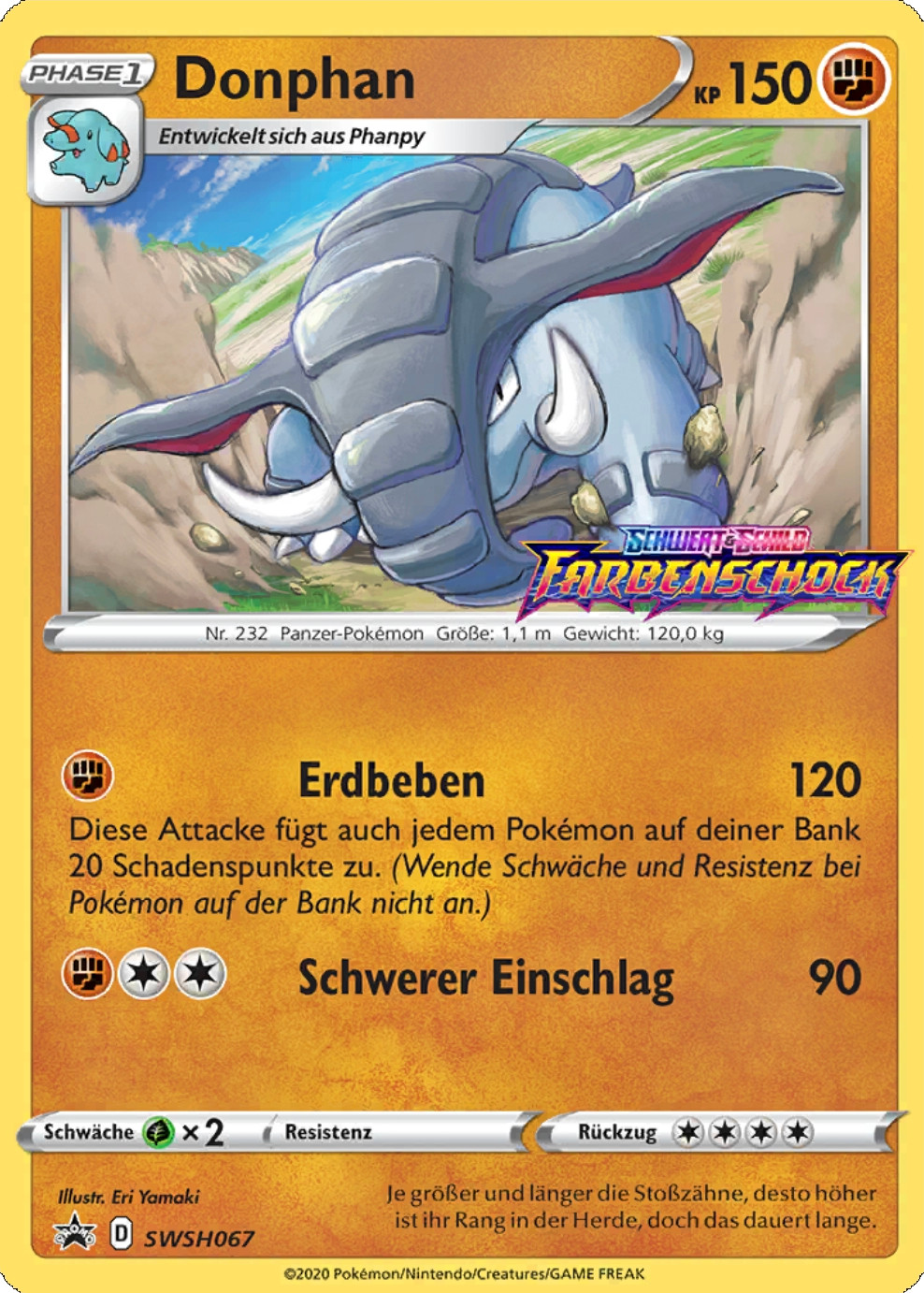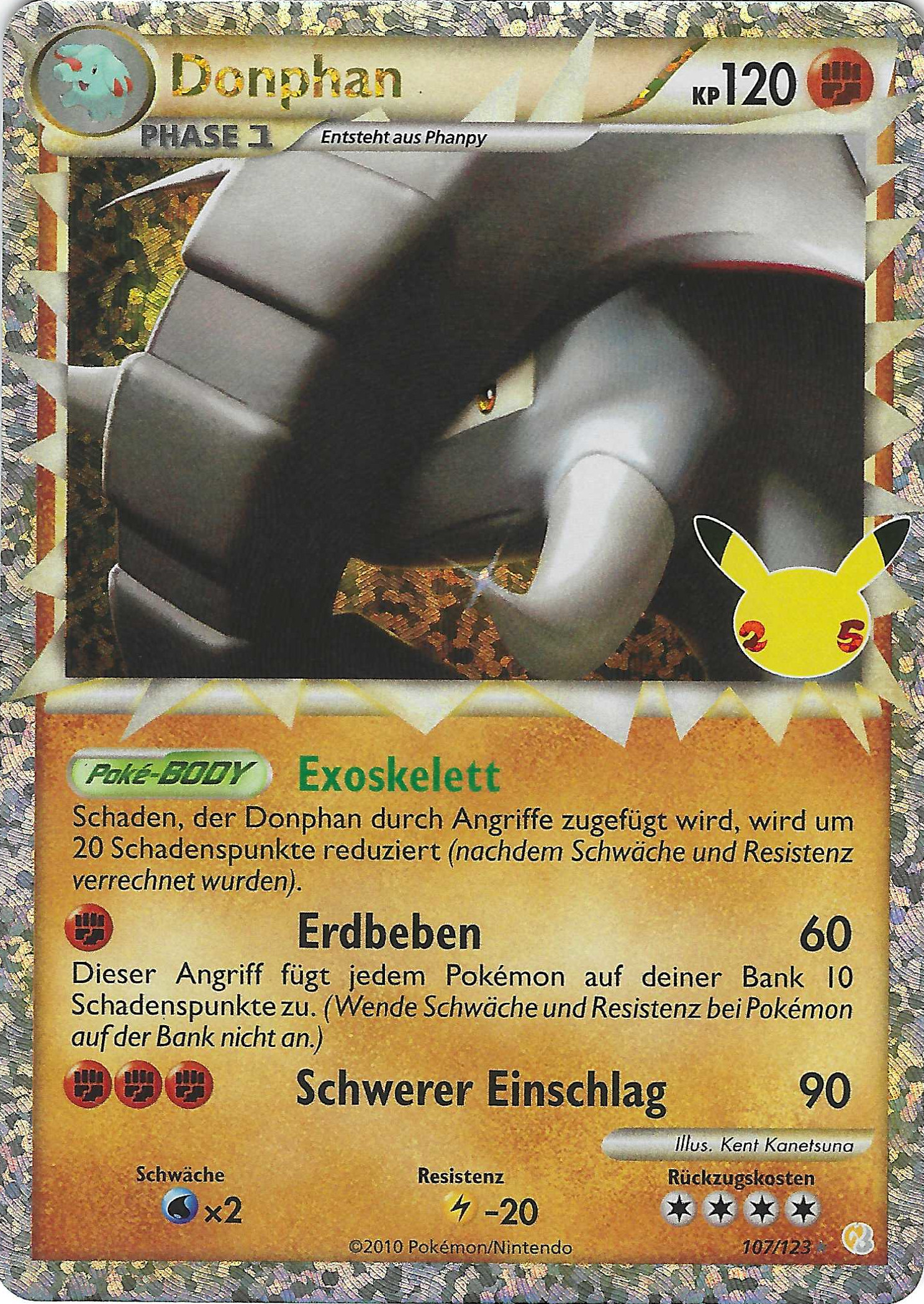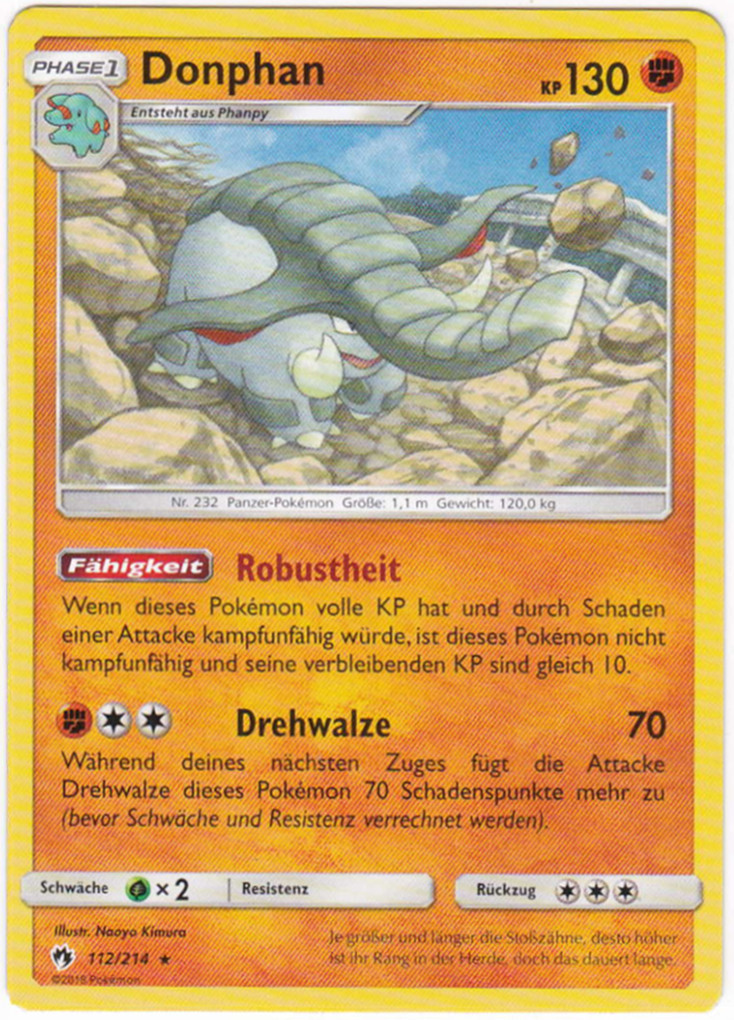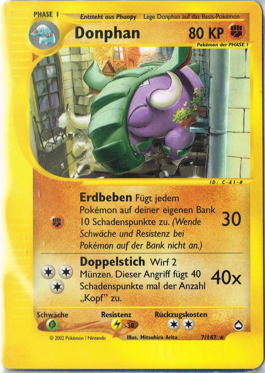 - AS Donphan kann mit seinem harten Körper sogar ein Haus zerstören. Mit seiner imposanten Kraft hilft dieses Pokémon dabei, Erdrutsche aus dem Weg zu räumen, die Bergpfade versperren.