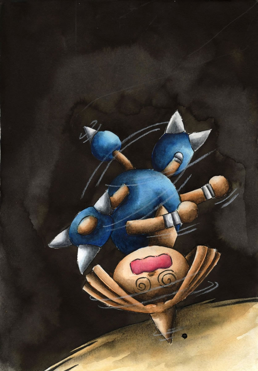 - GO Kapoera dreht sich auf dem Kopf stehend um die eigene Achse und teilt Tritte aus. Seine Technik ist eine bemerkenswerte Mischung aus Angriff und Verteidigung. Es bewegt sich drehend schneller voran als laufend.