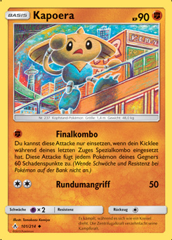 Kapoera ist dank Bedroher, passabler defensiver Stats und Zugriff zu einigen wichtigen Supportmoves für viele Generationen ein sehr solides Pokémon im Doppelkampf gewesen, allerdings hat setzt ihm die Dominanz der Kapus in der siebten Generation ziemlich zu. Kapu-Fala ist für Kapoera besonders schlimm, da sein Psychofeld sowohl Mogelhieb als auch Offenlegung aushebelt. Nichtsdestotrotz ist Kapoera noch spielbar und tut in etwa dasselbe wie in den vorigen Generationen auch: Den Gegner behindern und den Partner schützen. Durch Mogelhieb kann ein gefährlicher Gegner für eine Runde aus dem Spiel genommen werden, Rundumschutz ist sehr effektiv gegen Gegner wie Demeteros-T, deren wichtigste Attacken mehrere Ziele treffen. Pokémon, die anfällig gegen beliebte Spreadmoves wie Erdbeben, Steinhagel oder Lehmbrühe sind, profitieren besonders davon, zum Beispiel Ramoth. Offenlegung kann KOs auf sich eventuell schützende Gegner absichern und damit kann sich der Gegner generell nie sicher sein, ob ein sich schützendes Pokémon auch wirklich sicher ist. Die Attacke ergänzt sich auch gut mit Mogelhieb, der von Schutzschild geblockt werden kann. Weitere Optionen sind beispielsweise Rechte Hand, Steinkante - welche eher schwach ist, aber gegen bestimmte Ziele wie Ramoth und Mega-Glurak Y ihren Zweck erfüllt - sowie Scanner und Rapidschutz. Als STAB ist Nahkampf gesetzt, da Kapoeras andere Optionen sehr schwach sind; mit dem Z-Kristall kann man die Attacke einmalig verstärken und gleichzeitig ihren lästigen Effekt umgehen. Aber auch alternative Items sind spielbar: Eine Giefe- oder Tsitrubeere erhöhen Kapoeras Langlebigkeit, wohingegen ein Fluchtknopf Kapoera die Möglichkeit gibt, seinen Mogelhieb und Bedroher mehrmals zu benutzen, ohne eine Runde fürs Auswechseln opfern zu müssen. Somit kann man außerdem während einer Runde und somit schon unter Berücksichtigung eventueller Wechsel des Gegners ein für diesen bedrohliches Pokémon in den Kampf schicken. Allerdings birgt der Fluchtknopf auch Risiken - will man Kapoera einwechseln, um dann einen Gegner mit Mogelhieb auszubremsen, ist das nicht mehr ohne Weiteres möglich, da der Fluchtknopf Kapoera sofort wieder auswechselt, sollte es von irgendeiner Attacke getroffen werden. Ein guter Partner für Kapoera ist Kapu-Kime, welches Kapu-Falas Psychofeld überdecken kann und Kapoera vor Status wie Verbrennungen oder Schlaf schützt; auch Kapu-Riki und Kapu-Toro können gegen das Psychofeld helfen. Ansonsten soll Kapoera aber eher andere Teammitglieder unterstützen, als selbst unterstützt zu werden: Besonders hilfreich ist sein Support beispielsweise für Glurak, Ramoth und Despotar, die sowohl von Bedroher als auch Rundumschutz stark profitieren. Mit den obigen EVs kann Kapoera offensive Mega-Kangama selbst nach einem Bedroher noch mit Fulminante Faustschläge besiegen, der Rest wird in die Defensive - besonders Kapoeras schwache KP - gesteckt. Es sind aber auch viele andere EV-Splits möglich, und vor allem mit anderen Items bietet sich u.U. ein defensiverer EV-Split an. 252 KP / 172 SpV mit sachtem Wesen erlauben Kapoera u.a. das Überleben von Kapu-Falas Mondgewalt (und Psychokinese außerhalb des Psychofeldes), Kapu-Rikis Z-Donnerblitz, Wahlglas-Kapu-Kimes Zauberschein und Pelippers Orkan und können ein Orientierungspunkt für ein defensiveres Set sein.