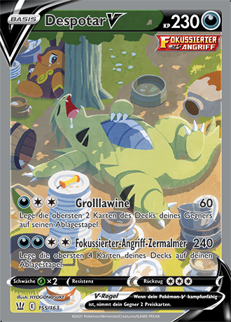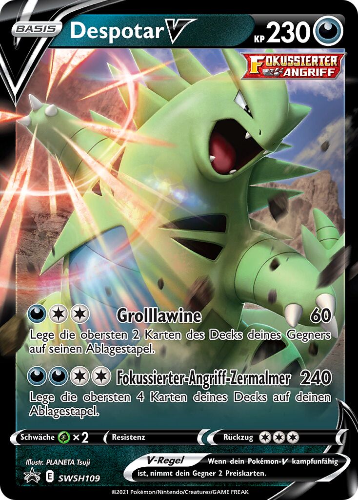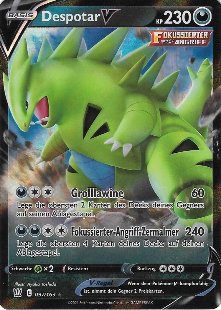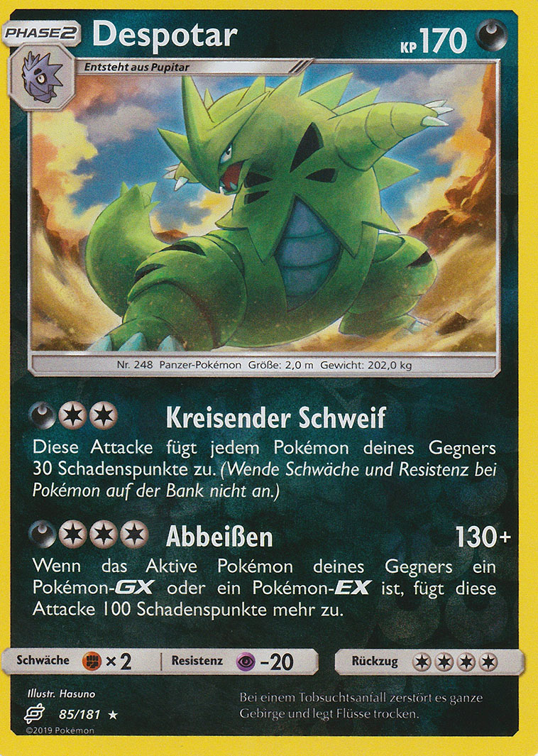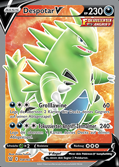 Despotar ist ein sehr guter Nutzer von Schwächenschutz, da es sehr viele omnipräsente Schwächen hat, aber die meisten sehr effektiven Attacken selbst ohne irgendwelchen Support überlebt. Partner mit Bedroher, wie Demeteros-T, Brutalanda (vor der Mega-Entwicklung) oder Kapoera helfen zusätzlich, und machen es für Gegner oft zu einem großen Risiko, Despotar mit nur einem Pokémon anzuvisieren. Ein möglicher Double-Target kann aber wiederum durch Schutzschild vereitelt werden, das deshalb auf diesem Set auch unverzichtbar ist. Als Angriffe verwendet Despotar einfach seine konstantesten STABs; Steinkante kann parallel zu Steinhagel gespielt werden, um gegen einzelne Gegner erheblichen Schaden anzurichten - Despotars STAB-Kombination wird ohnehin von kaum einem häufigen Pokémon resistiert. Alternativ können auch diverse andere Angriffe verwendet werden, neben den oben gelisteten kommen auch noch beispielsweise Feuerschlag, Gewissheit und Kraftkoloss in Frage. Der EV-Split maximiert Angriff und investiert den Rest in den Bulk, aber hier besteht einiger Variationsspielraum. Auf etwas Angriff kann verzichtet werden, um mit zusätzlichem defensiven Investment gezielt einige Attacken zu überleben; auch können EVs aus den Defensivwerten und/oder dem Angriff abgezweigt werden, um Despotar etwas mehr Initiative zu verschaffen, was insbesondere hilfreich ist, wenn es mit Rückenwind-Support gespielt wird. Auch Bizarroraum-Support harmoniert gut mit Despotar, in diesem Fall kann man alle Initiative-EVs weglassen und auf ein mutiges Wesen mit 0 Init-DVs zurückgreifen. Neben den oben erwähnten Bedroher-Nutzern eignen sich als Despotars Partner auch gut Pokémon, die über Speedcontrol-Optionen verfügen, z.B. Rückenwind (Mega-Brutalanda, Zapdos) oder Bizarroraum (Cresselia). Stalobor kann außerdem gespielt werden, um von Despotars Sandsturm zu profitieren. Weitere geeignete Partner sind Pokémon, die Kampfpokémon und häufige Nutzer von Kampfattacken bedrohen, beispielsweise die Kapus.