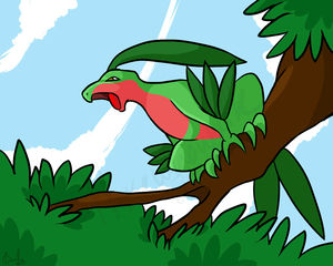 - OR Reptain kann sich mit den Blättern, die aus seinem Körper herauswachsen, im Wald hervorragend tarnen. Dieses Pokémon ist ein wahrer Meister darin, auf die Bäume des Dschungels zu klettern.
