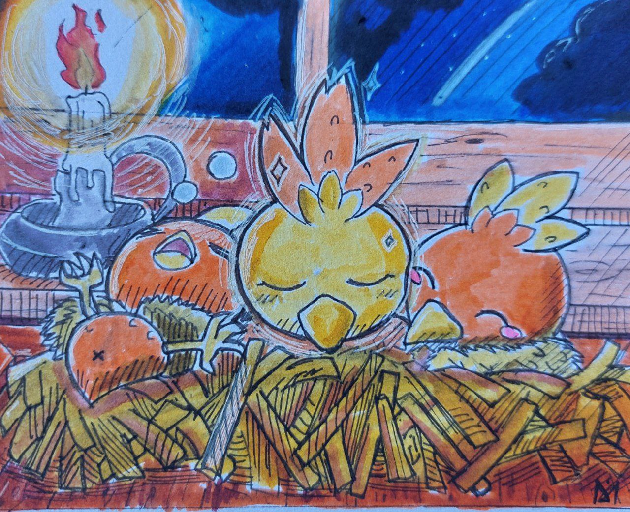 An diesem Abend hatte sich die Familie zum Filmgucken versammelt. Kurz bevor es losging, wuselte Picochilla noch durch die Gegend und kam dabei mit dem Schwanz unter Flamaras Nase. Er versuchte es zurückzuhalten, musste dann aber doch niesen und versprühte dabei einige Funken. Die meisten verloschen sofort, doch zwei kleine Funken fielen auf das Ei. Neugierig legte er die Vorderpfoten auf den Tisch und betrachtete das leicht wackelnde Ei.