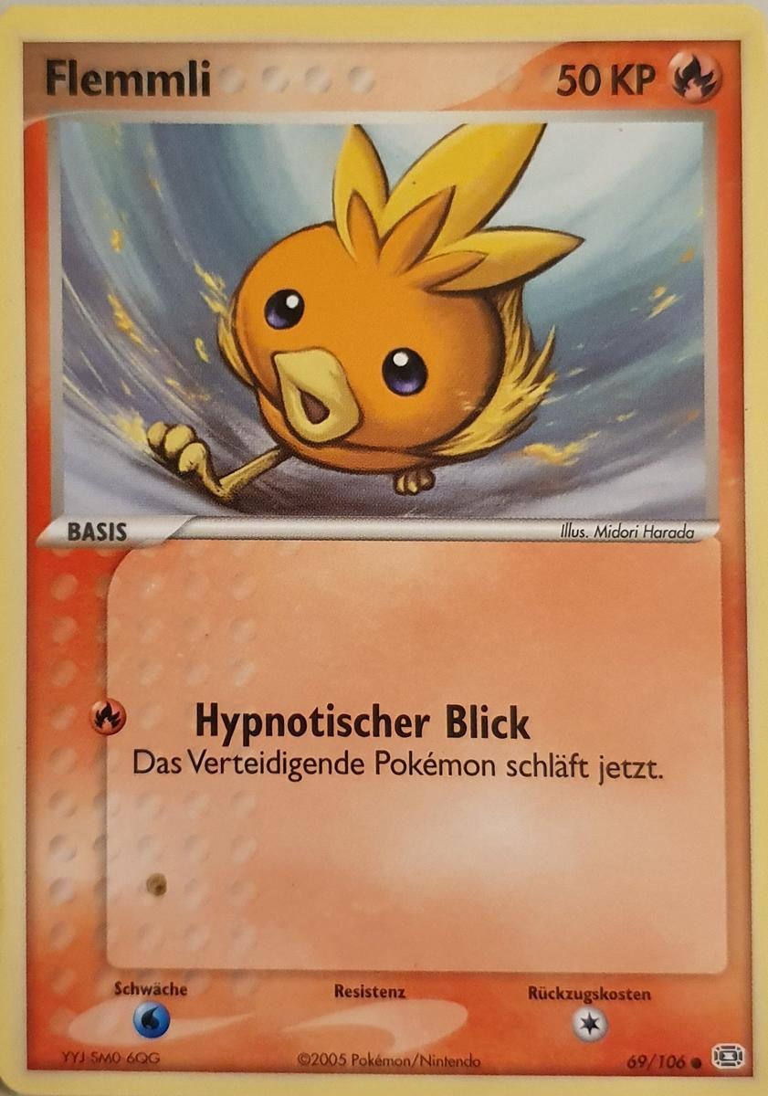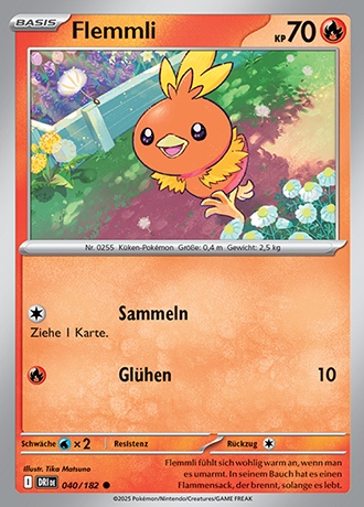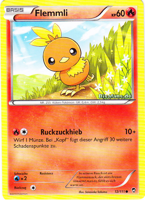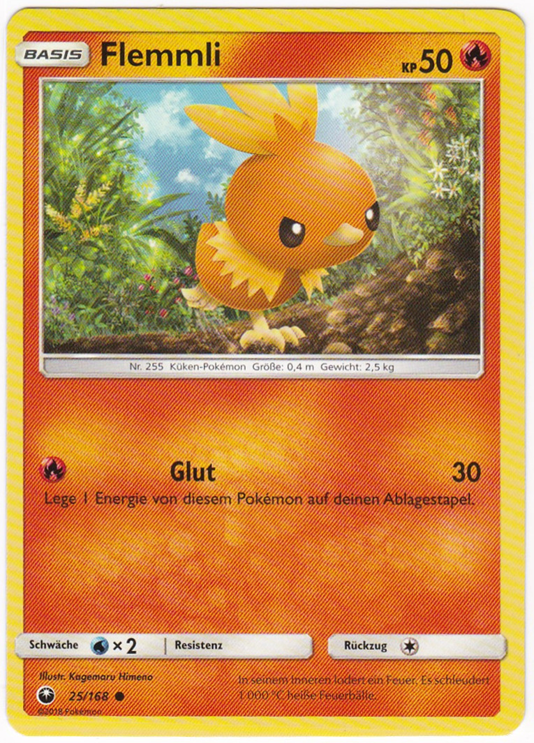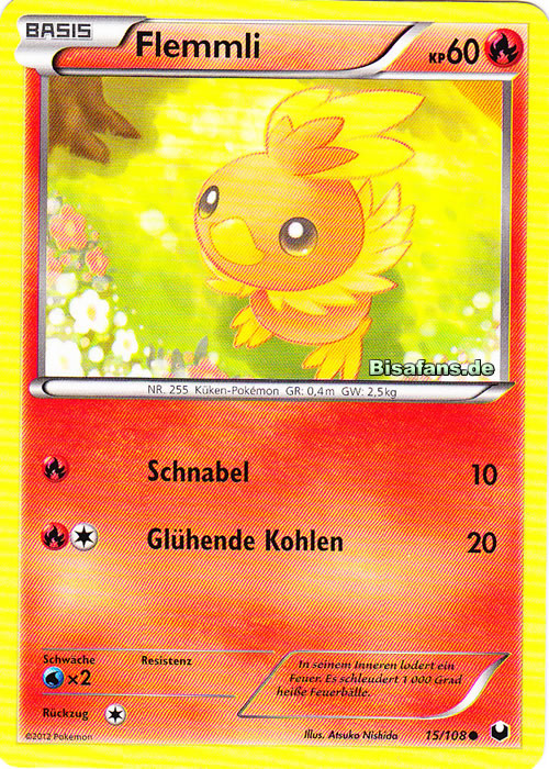 - S In FLEMMLIs Körper brennt eine Flamme. Wenn man es umarmt, beginnt es zu glühen. Dieses POKéMON trägt ein flauschiges Fell aus Daunen.