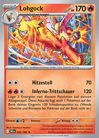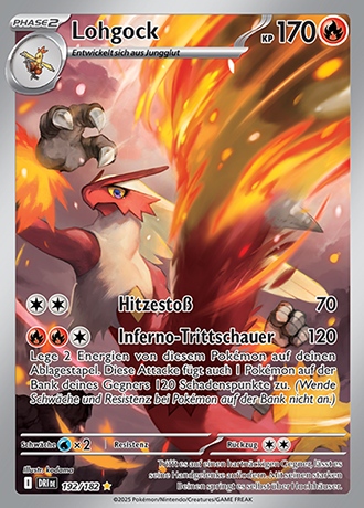 - R LOHGOCK stößt heftige Flammen aus seinen Handgelenken aus und greift seine Feinde mutig an. Je stärker ein Feind ist, desto stärker lodern die Handgelenke dieses POKéMON.