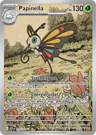 - AS Papinella hat einen langen Rüssel, der hervorragend zum Sammeln von Blütenpollen geeignet ist. Dieses Pokémon flattert im Frühlingswind herum und sammelt Blütenstaub.