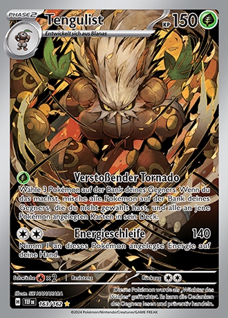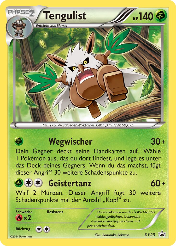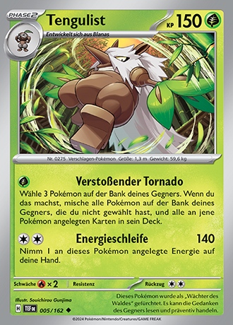 - OR Tengulist ist ein geheimnisvolles Pokémon, das angeblich auf hohen Bäumen lebt, die Tausende von Jahren alt sind. Mit den Blätterfächern an seinen Händen kann es heftige Stürme erzeugen.