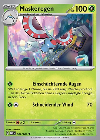 - OR Maskeregen schüchtert seine Feinde mit den augenähnlichen Mustern auf seinen Antennen ein. Dieses Pokémon kann mit seinen vier Flügeln wie ein Hubschrauber in jede Richtung fliegen, sogar seitwärts und rückwärts.