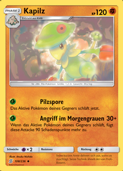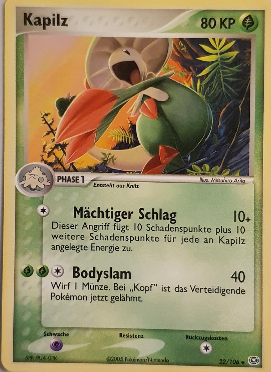 - OR Mit leichtfüßiger Beinarbeit nähert sich Kapilz seinen Feinden und schlägt dann mit seinen dehnbaren Armen um sich. Die Kampftechnik dieses Pokémon treibt Profiboxern die Schamesröte ins Gesicht.
