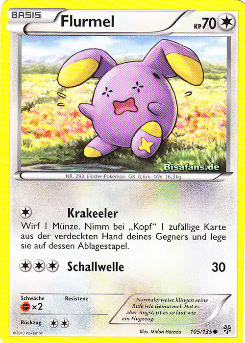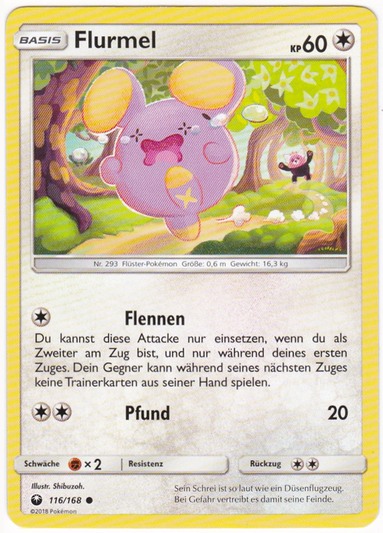 - GO Normalerweise ist Flurmels Stimme sehr leise, selbst mit größter Anstrengung ist sie kaum hörbar. Wenn dieses Pokémon jedoch eine Gefahr wittert, stößt es ohrenbetäubende Schreie aus.