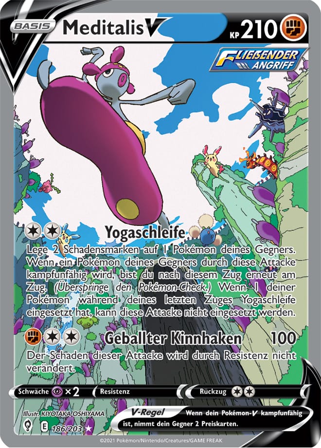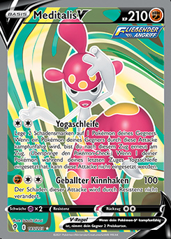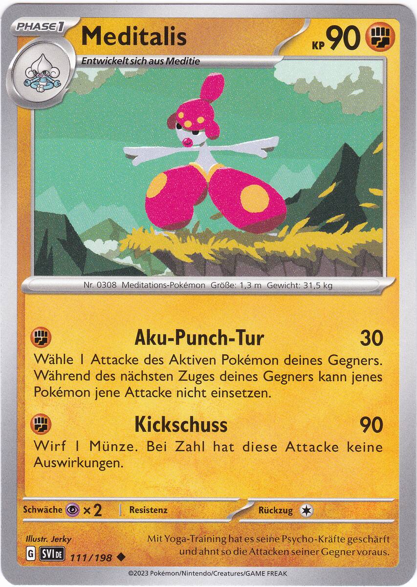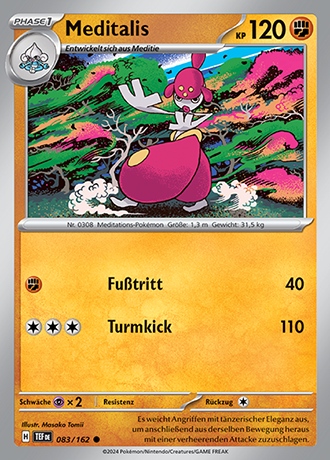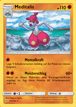 - OR Mittels Meditation erhöht Meditalis seine Körperenergie und schärft seinen sechsten Sinn. Dieses Pokémon verbirgt sich, indem es eins mit den Feldern und Bergen wird.