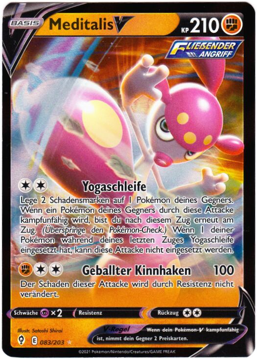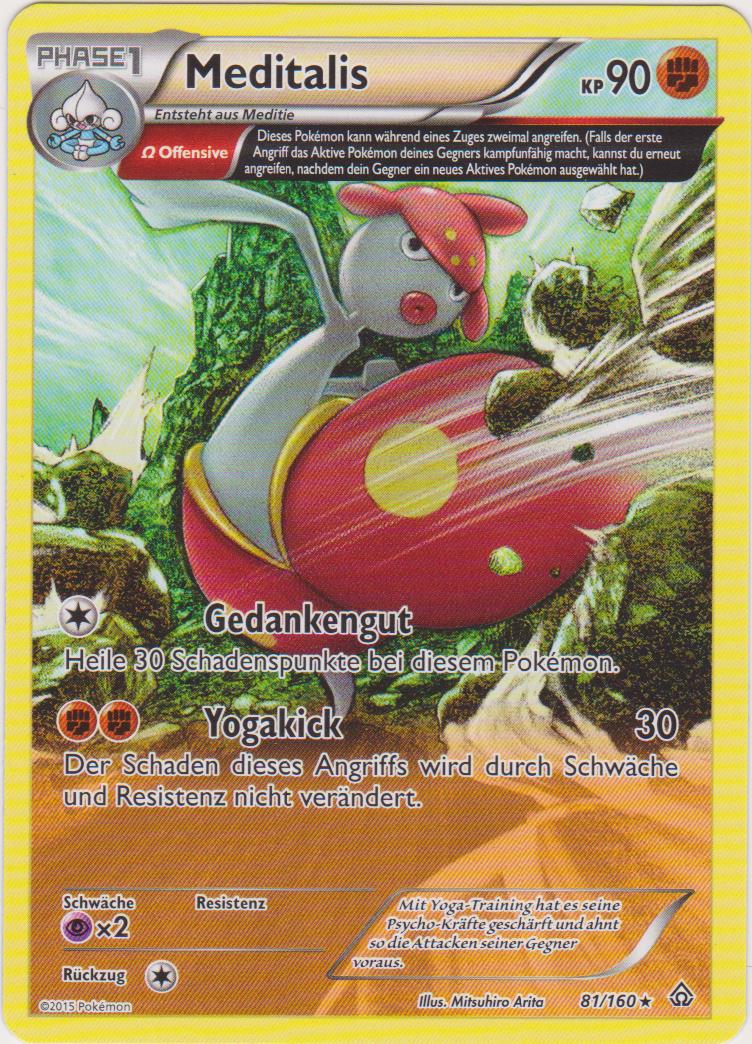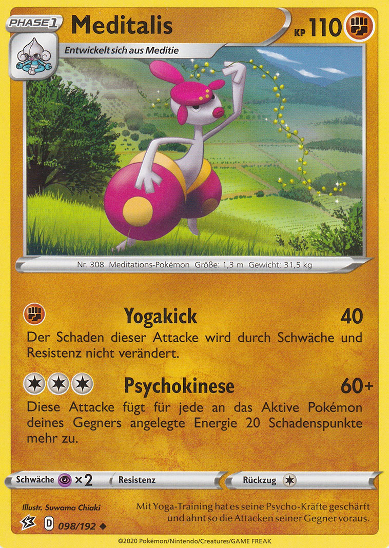 - S Mittels Meditation hat MEDITALIS seinen sechsten Sinn entwickelt. So kann es seine psychokinetischen Kräfte nutzen. Dieses POKéMON meditiert einen ganzen Monat ohne etwas zu essen.